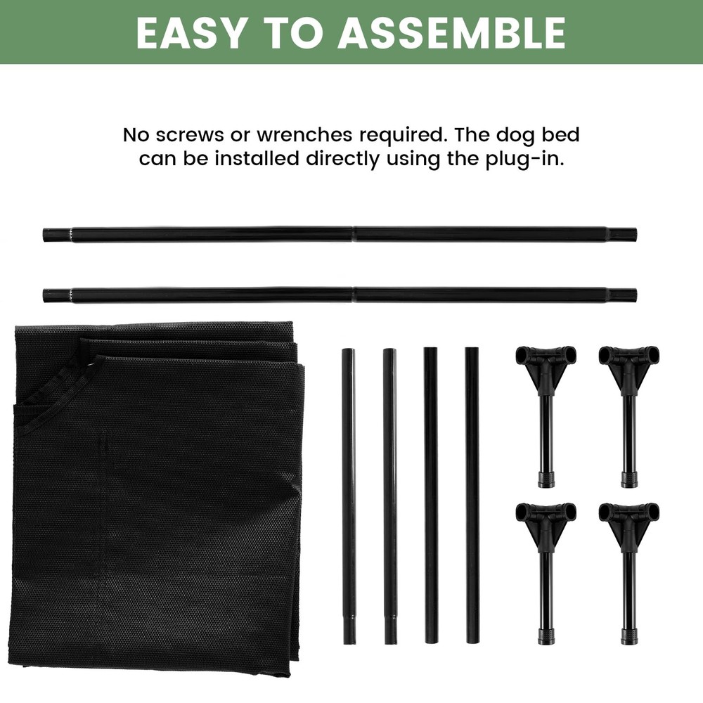 Durability: Heavy-duty powder-coated steel frame supports up to 150 pounds with reinforced joints for large breed dogs Breathable Comfort: Textilene mesh fabric promotes airflow to keep pets cool in summer and warm in winter Health Benefits: Elevated 10-inch design keeps pets off cold/damp floors to reduce joint pressure and allergy risks Portable Design: Simple plug-in assembly with no tools required; lightweight for indoor/outdoor use Certified Materials: Made with certified fabrics that meet strict chemical emissions standards