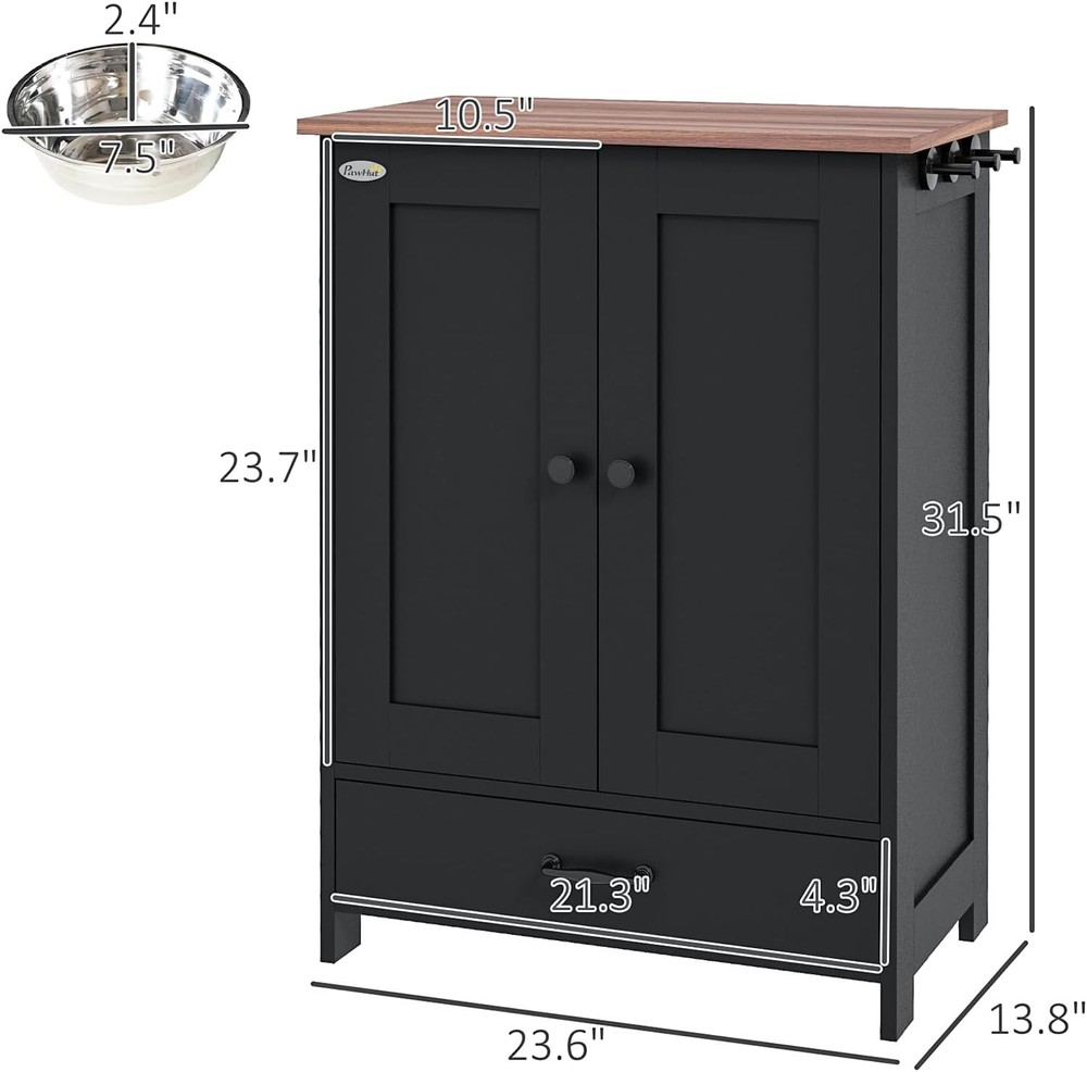 Product Description About this item Hidden Pet Food Container: The dog food storage cabinet is designed with a bottom pull-out drawer. When eating, pull out the bottom drawer to reveal the food and water bowls. When the feeding time is over, just push it back. Keep your environment as clean and tidy as ever. Store Pet Supplies: Use this pet feeding station to store all your pet supplies in one place. Three hooks on the side can hang harnesses and leashes. Cabinet can store food bags. Countertop can store cans, pet jackets or treats. Use at Home: You can use this pet food storage cabinet as a coffee table in the living room or a side table in the office or bedroom. Suitable for Bulldog, Boston Terrier, Chihuahua, Shih Tzu, Yorkshire Terrier, Labrador Retriever, Golden Retriever, German Shepherd, Rottweiler, Doberman Pinscher, etc. Beautiful and Sturdy: Our pet feeding station has a particleboard frame and base that is smooth and easy to keep clean. Comes with 2 stainless steel bowls for safe and hygienic feeding of your pets, creating a vintage industrial look that blends seamlessly into any home decor. Overall dimensions are 23.6"L x 13.8"W x 31.5"H. Installation and Service: The elevated dog bowl holder includes clear illustrated instructions and all accessories for easy installation. If you encounter any product problems after purchasing the pet storage box from us, regardless of its quality or use, don't worry, please feel free to contact us. We will provide you with a satisfactory solution and give you a good shopping experience. Product Features Hidden Feeding Solution: This dog feeding station includes two concealed bowls, ensuring a tidy space for your pet to enjoy their meals - great for maintaining a clean and organized area. Versatile Storage: Equipped with a pet food storage cabinet featuring a removable panel and three adjustable heights, this pet station adapts to your storage needs, simplifying pet mealtime routines. Convenient Accessories: This pet dish bowl set with storage offers three side hooks for hanging leashes or collars, keeping your pet's accessories organized and within reach. Stylish and Functional: The large top of our dog food storage container with bowls is a functional piece of furniture, blending seamlessly with your home decor while providing a dedicated space for your pet's feeding area. Dog Feeder Station Info: Overall Dimensions: 23.6" L x 13.8" W x 31.5" H. Suitable for medium-sized pets measuring 14"-20" in shoulder height. Assembly required. Specification Main Material: Particle Board Product Dimensions: 23.6"L x 13.8"W x 31.5"H. Weight (lbs.): 18.20 Package Size: 36"L x 25.4"W x 5.7"H. Weight (lbs.):45.20
