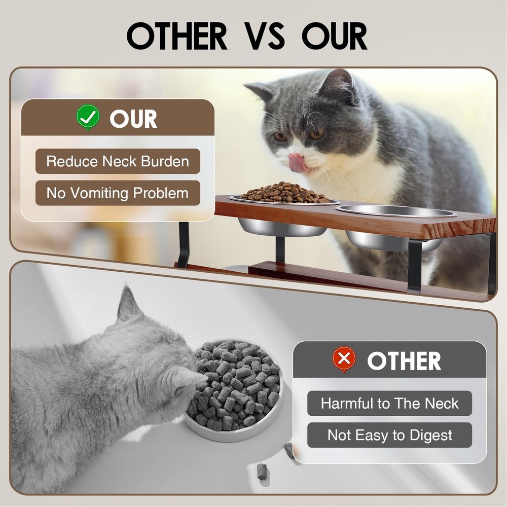 15°Tilted Elevated Cat Bowls with Food Mat, 2 Stainless Steel Bowls 【Easy to Assemble】 Step 1: Connect the bowl holder to the iron frame with screws. Step 2: Use screws to connect the 2 fixed wooden slats with the corresponding holes, and put a non-slip pads on each of the bottom 4 feet to avoid scratching the floor 【Packing List】 Elevated cat bowls set includes 1 x solid wood bowl holder, 2 x fixed solid wood plates, 2 x iron frames, 2 x stainless steel bowls, 1 x silicone food mat, and accessories: 1 x screwdriver, 8 x screws, 6 x non-slip pads 【Solid Wooden Stand】 Our cat bowl is made of natural wood, anti-deformation. It is polished to be thornless, no odorless, will not harm your pet (Note: Wood products should not be exposed to continuous humidity. If it gets wet, please dry it in time !) 【Upgraded Pet Bowls】 2 stainless steel bowls, each with a capacity of 12.9 OZ. Silicone food mat can prevent cats and puppies from spilling food residues on the floor while feeding, and keep the room or carpet clean. Food mat size: 18.9" x 11.8" 【15° Tilted Design】 Our cat bowls elevated tilted 15° design protect the cervical spine of pets, which can effectively relieve the pressure on the neck and stomach of cats when eating, and help reduce the risk of vomiting and indigestion