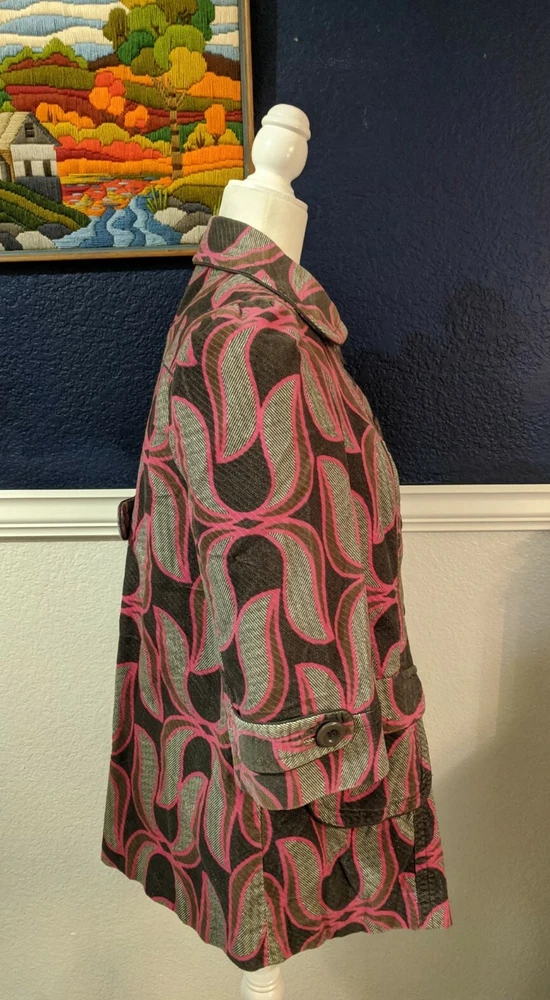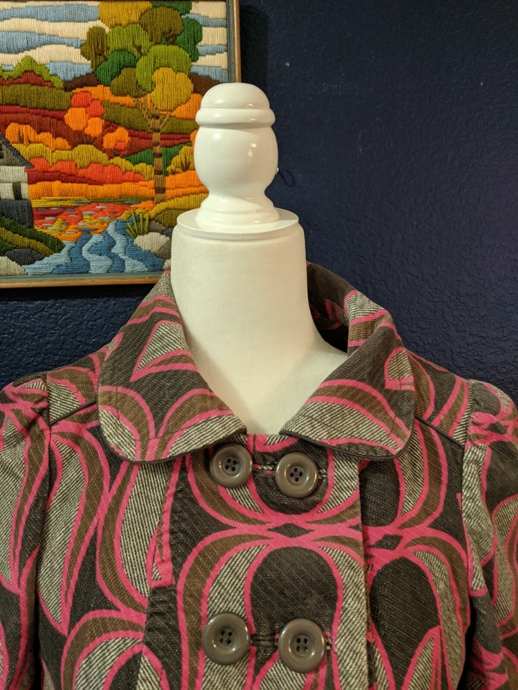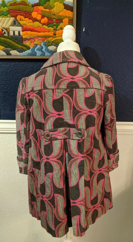 Elevenses Anthropologie Geometric Pink Gray Retro Coat Double Breasted 8 Medium 100% cotton (shell); 100% cotton (body lining); 100% polyester (sleeve lining) 37" chest; 29" length; 18.5" sleeve length Machine wash cold Anthropologie's customer is a creative-minded woman, who wants to look like herself, not the masses. She has a sense of adventure about what she wears, and although fashion is important to her, she is too busy enjoying life to be governed by the latest trends. To her, Anthropologie is a portal of discovery—a brush with what could be. A place for her to lose—and find—herself. FieldFlowerFinds is dedicated to finding beautiful secondhand treasures and getting them to you. H101 Policy: If you are unsatisfied with your item, please contact me so we can work it out! All returns must be sent back in the same condition as received Refund amount for returned item will be the total amount minus the original shipping