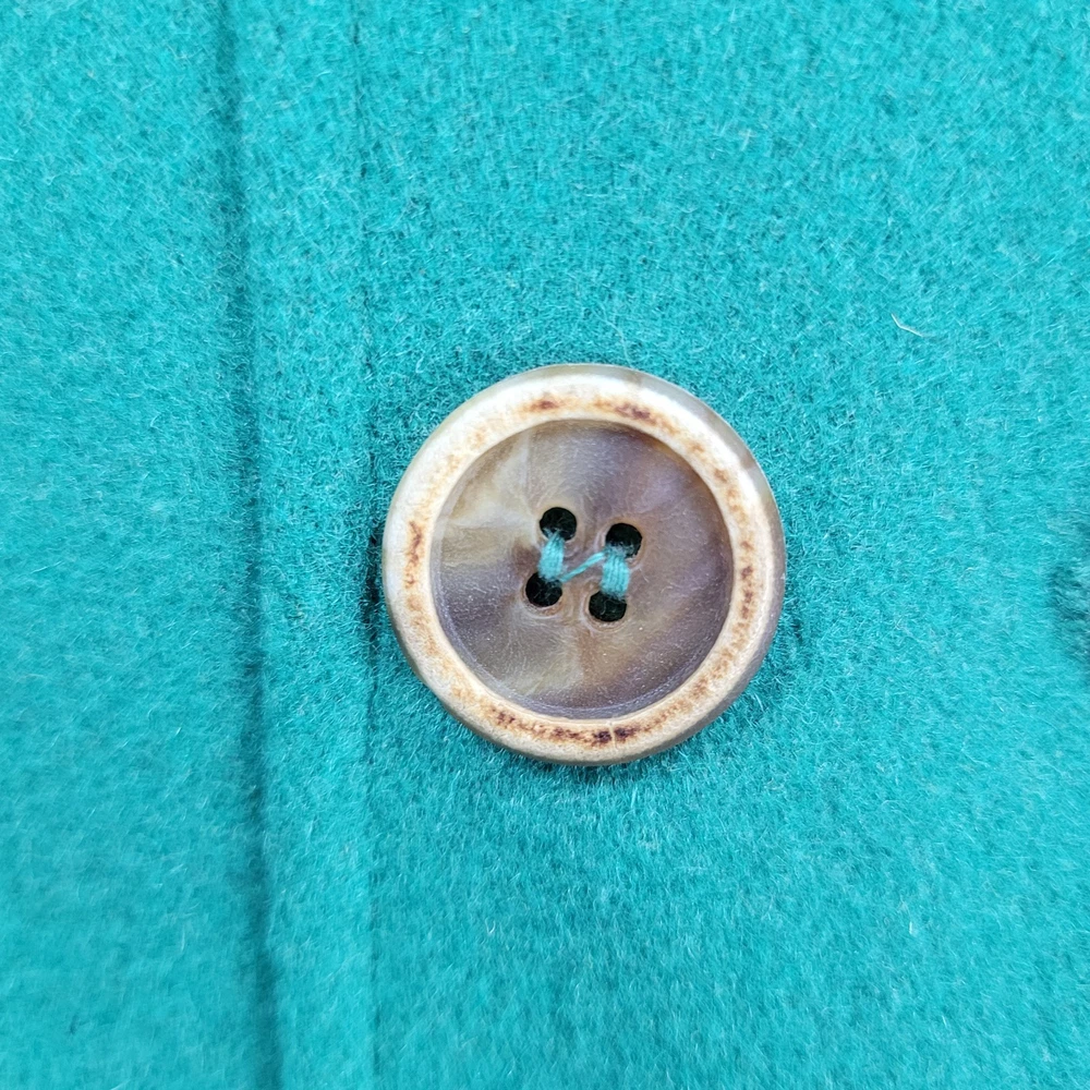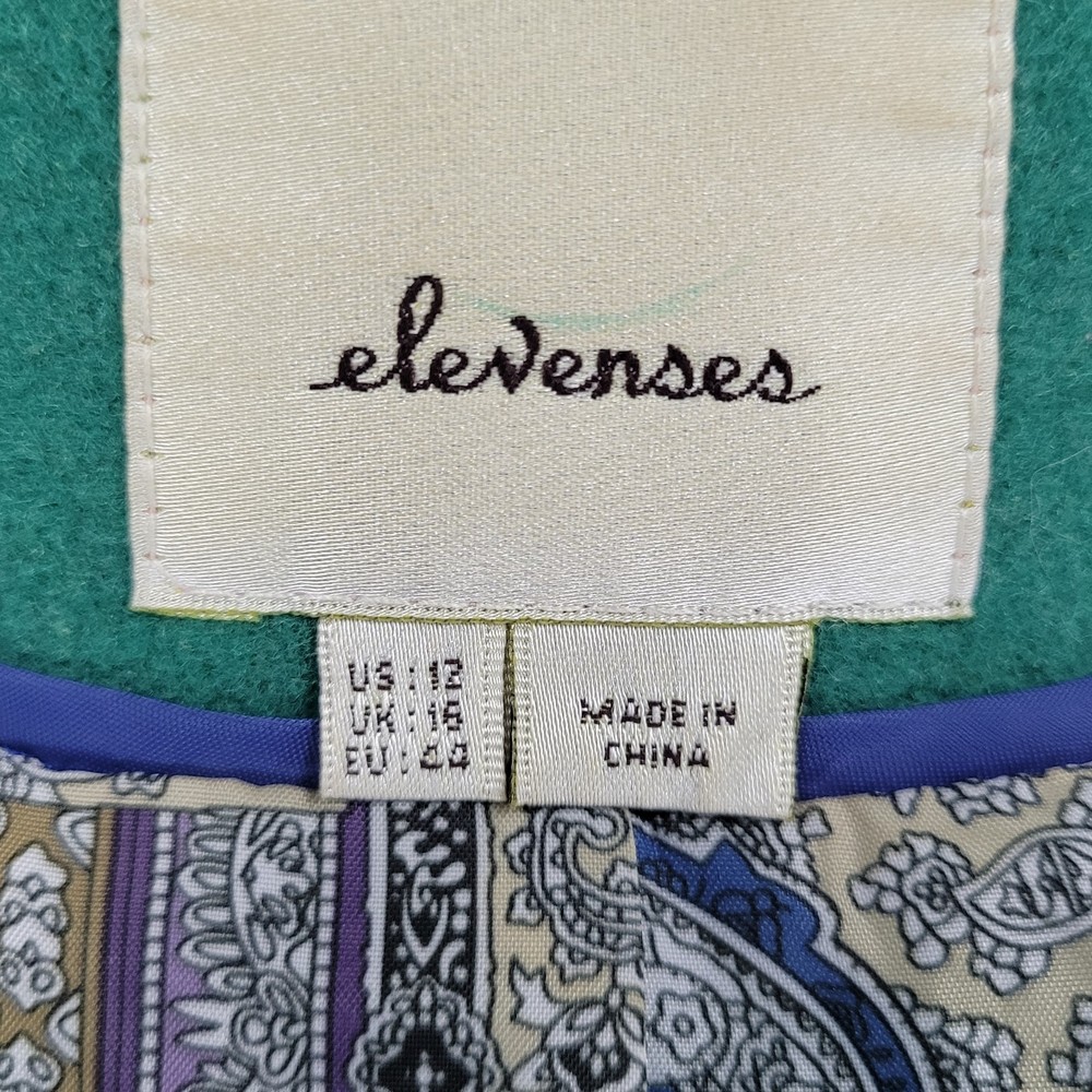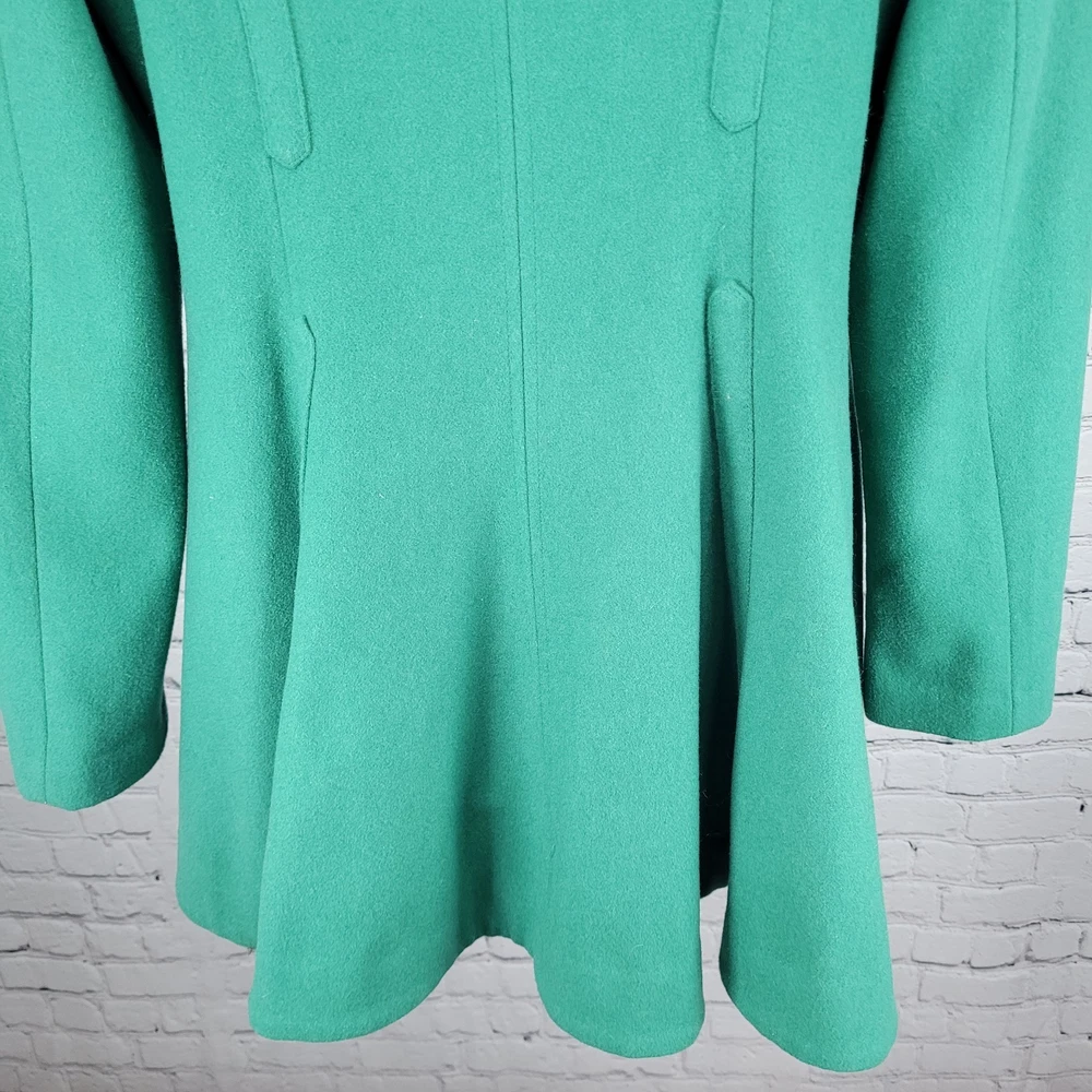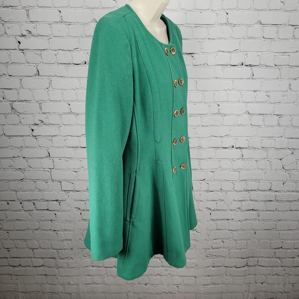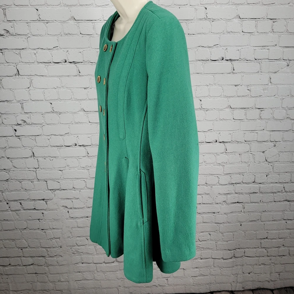 The Elevenses Anthropologie Green Wool Blend Double Breasted Buttoned Pea Coat in size 12 is a stylish and sophisticated addition to any women's wardrobe. Made from a warm wool blend with a cozy lining, this jacket is perfect for colder weather. Its classic pea coat design, complete with double-breasted buttons, adds a touch of vintage charm to any outfit. The rich green color adds a pop of color to your look, making it a versatile piece that can be dressed up or down for any occasion. Pit to pit 19" Shoulder to hem 34" Sleeve outer 26.5"