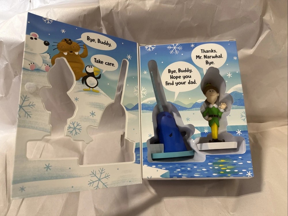 Brand New Elf: BUDDY THE ELF & NARWHAT (2025) Hallmark Christmas Ornaments #3HCM4143 Determined to find a place where he belongs, Buddy the Elf leaves the North Pole in search of his real dad in New York City. Relive the heartwarming scene from the movie "Elf" when the narwhal surfaces from the icy ocean to wish Buddy good luck with this set of two Christmas tree ornaments featuring Buddy and the talking whale. The coordinating decorations come packaged in a delightful, themed storage box that opens and captures the spirit of the hilarious holiday movie. Hallmark Ornaments are a great way to commemorate hobbies, life events and individual interests in entertainment, sports and more. Each festive and collectible ornament is perfect for sharing with family and friends. Spread Christmas cheer with these Hallmark Christmas ornaments featuring Buddy the Elf and the narwhal from the holiday movie "Elf." Set of 2 packaged in themed storage box. Great gift idea for fans of the modern classic holiday movie "Elf." Plastic ornaments with hanger attachments. Includes: Two Hallmark Christmas ornaments packaged in a themed box. Approx. Size in Inches: (Buddy) 2.25 x 4.25 x 1.75 (narwhal) 2.5 x 4.75 x 2.5