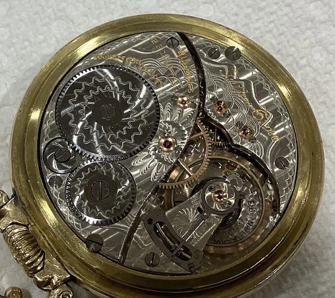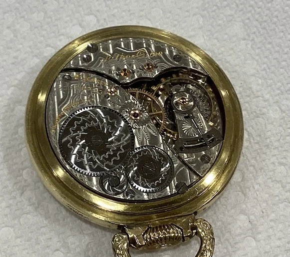 For your consideration is this circa 1921 Elgin Father Time Grade 454 Model 15 Railroad Grade 21 jewel, size 16, open face, lever set, adjusted to 5 positions Men’s pocket with Simmons watch chain. The case and movement are both in good preowned condition with normal wear from age and use, the case has some light scratching as does the crystal but the plating is strong and I see no dents. The porcelain or enamel dial looks great with no damage. The case is marked “STAR WATCH CASE COMPANY 10 KT. GOLD FILLED , see photos. The Simmons chain is marked “SIMMONS” and is n good condition. The watch itself has been running and keeping time but I have not had it cleaned or tested for exact timing so as always it may need adjustment after shipping. Check out all of the photos for the best description and ask questions if you have them. Please check my other listings as I will be listing several Railroad Grade Pocket Watches from the estate of a collector. The serial number on this pocket watch is “23128793”. My shipping charge includes insurance for the final value realized on the watch and I pack very securely. Thanks for looking and good luck should you decide to bid.