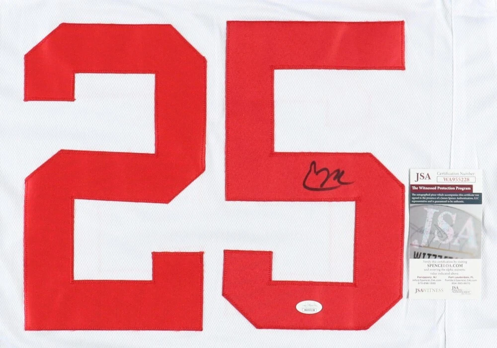 Own a piece of history with this Elijah Mitchell autographed jersey. This jersey features the signature of the star player and has been authenticated by James Spence Authentication and includes an official JSA Certificate of Authentication ensuring its authenticity and providing peace of mind. This collectible is perfect for any San Francisco 49ers fan and makes for a great addition to any sports memorabilia collection. This authentic hand signed, high quality custom jersey has sewn numbers/names in the player's teams colors and comes in size XL. The jersey is not affiliated with team or league. Get your hands on this collector's item today!
