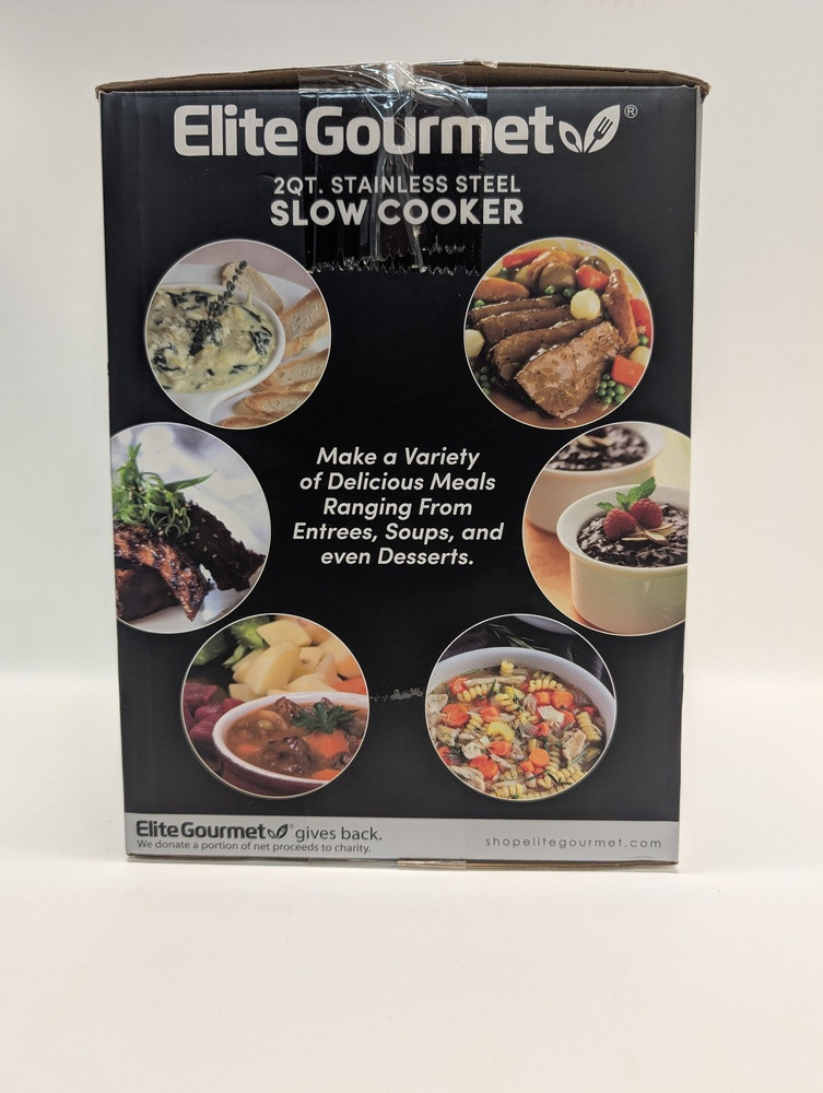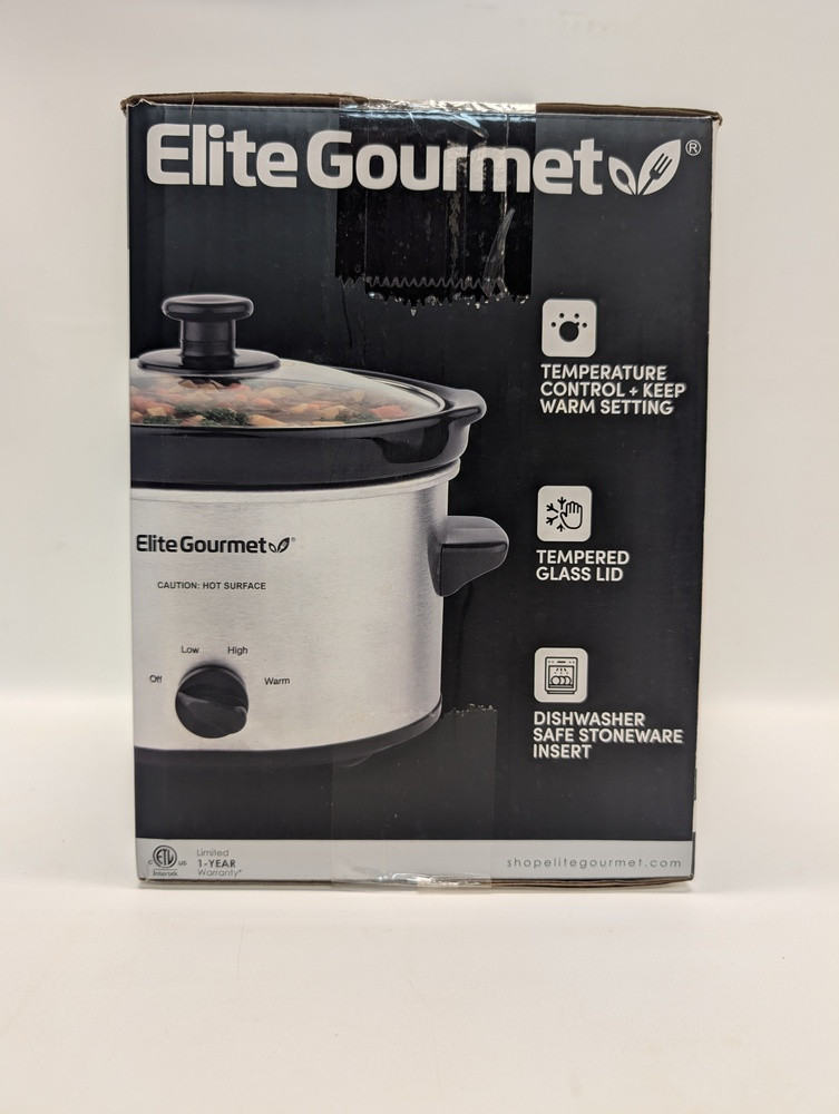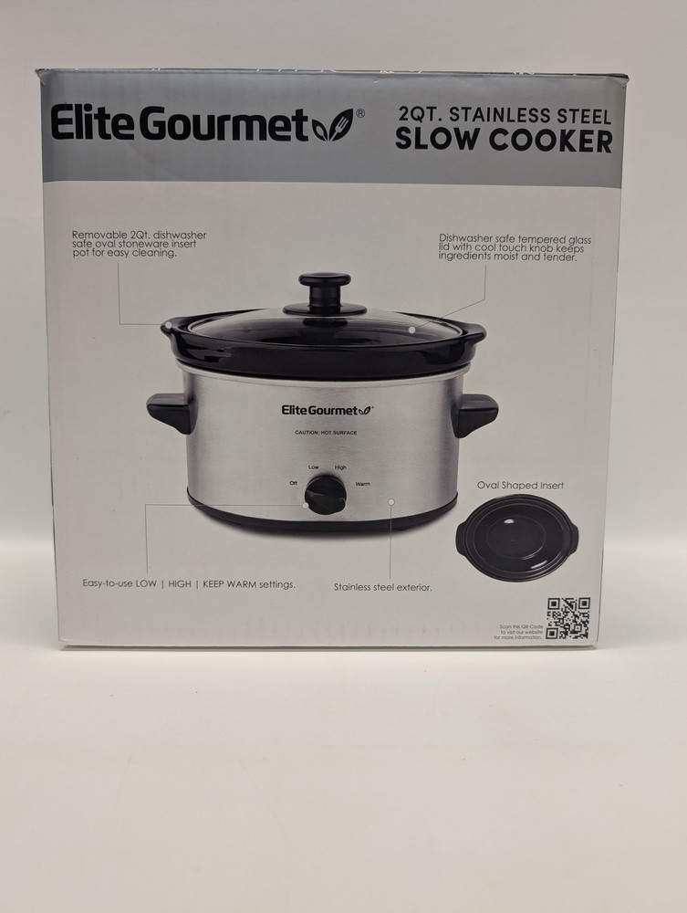 This is a preowned still in box Elite Gourmet 2Qt Oval Slow Cooker. Discover the joy of effortless cooking with the Elite Gourmet 2Qt Oval Slow Cooker. This stainless steel appliance boasts low, high, and warm settings for versatile use. Experience stress-free meal preparation and enjoy delicious, slow-cooked recipes at your convenience.
