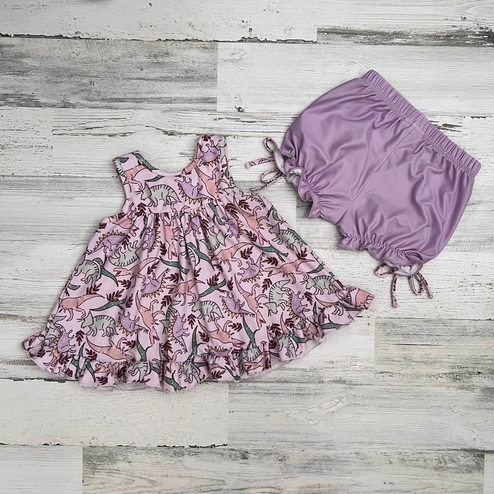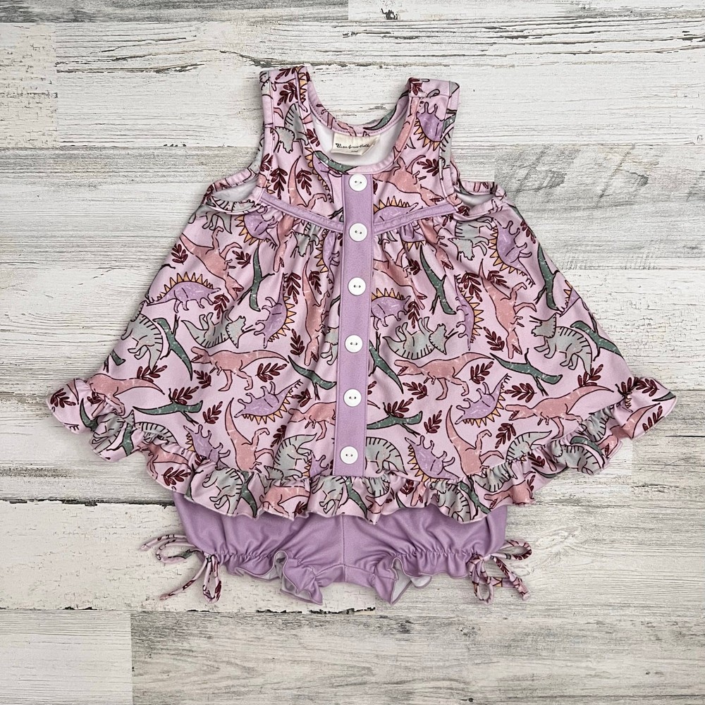 Sweet and playful Eliza Grace two-piece outfit featuring a dinosaur print tunic top with ruffle trim and coordinating bloomers. Lightweight and comfortable for everyday wear, playdates, or themed occasions. Styling suggestion: Wear as a matching set with sandals for warm days or layer the tunic over leggings as temperatures cool. Details: • Brand: Eliza Grace • Size: 12 Months • Color: Pink, lilac, aqua, green • Material: 95% Polyester, 5% Spandex • Style: Two-piece tunic and bloomer set • Features: Dinosaur print, ruffle hem, decorative front buttons, matching bloomers • Neckline: Round • Sleeve: Sleeveless • Closure: Pullover top • Fit: Regular • Pattern: Dinosaur / novelty print • Occasion: Playwear, casual, themed events • Season: Spring, Summer • Condition: Very good used condition Keywords: dinosaur, playful, toddler, summer, novelty, casual, outfit, girls Ships fast from a U.S. seller. Clean, smoke-free, pet-friendly home. Bundle to save!