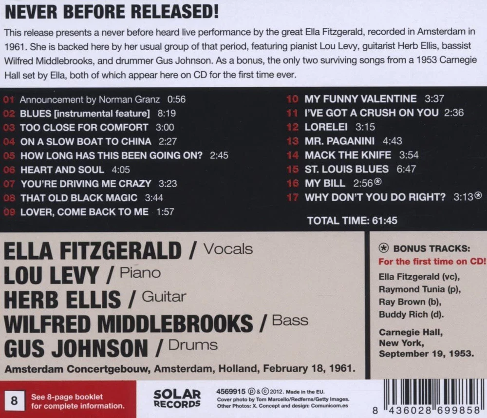 Further Details Title: The 1961 Amsterdam Concert Condition: New Genre: Jazz Format: CD Description: Digitally remastered collection containing a never before heard live performance by the great Ella Fitzgerald, recorded live in Amsterdam in 1961. She is backed here by her usual group of that period, featuring pianist Lou Levy, guitarist Herb Ellis, bassist Wilfred Middlebrooks, and drummer Gus Johnson. As a bonus, the only two surviving songs from a 1953 Carnegie Hall set by Ella, both of which appear here on CD for the first time ever. Includes 8-page booklet. Solar Records. Artist: Ella Fitzgerald No Of Discs: 1 Record Label: Solar Records EAN: 8436028699858 Missing Information? Please contact us if any details are missing and where possible we will add the information to our listing.