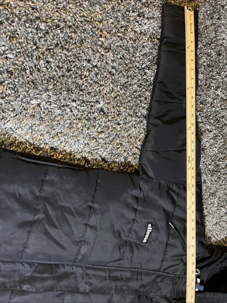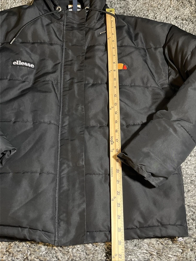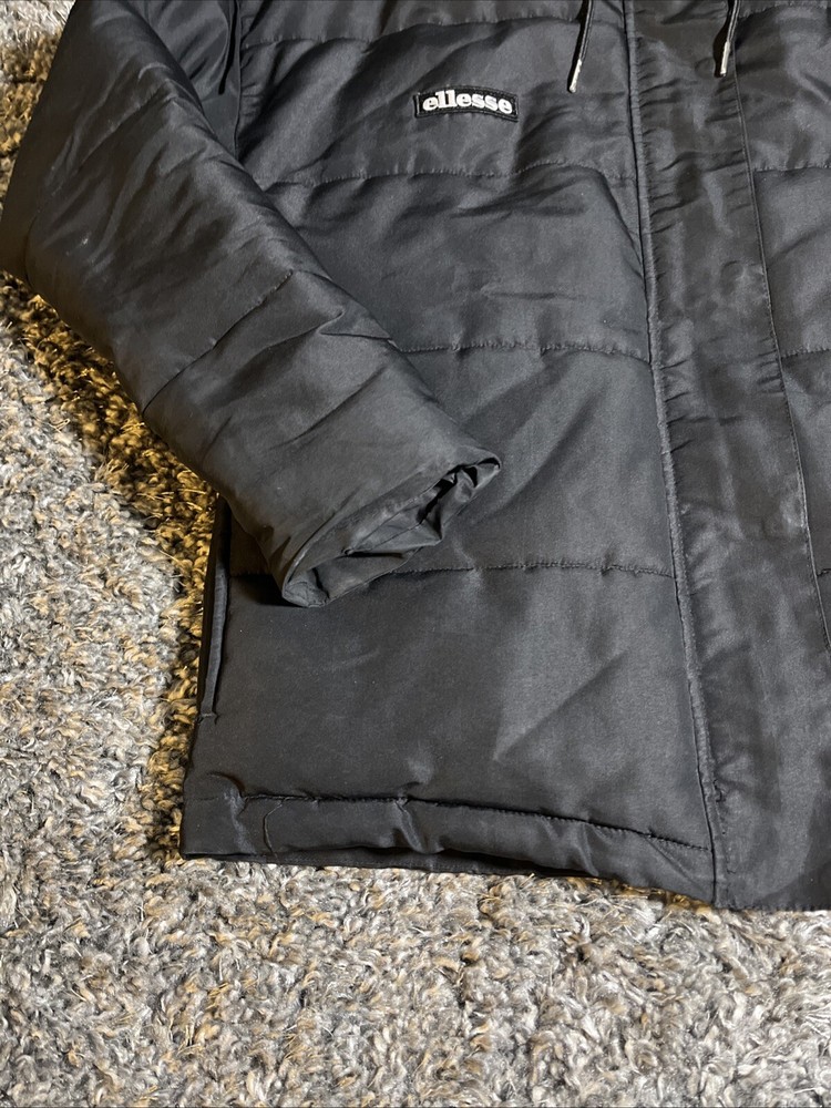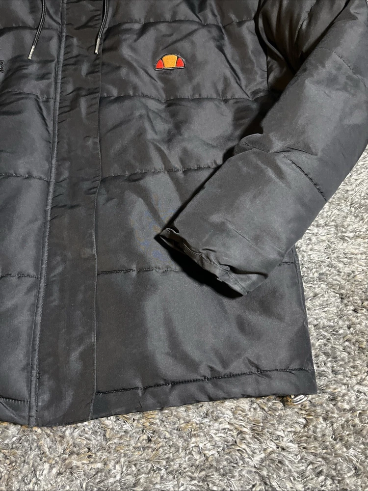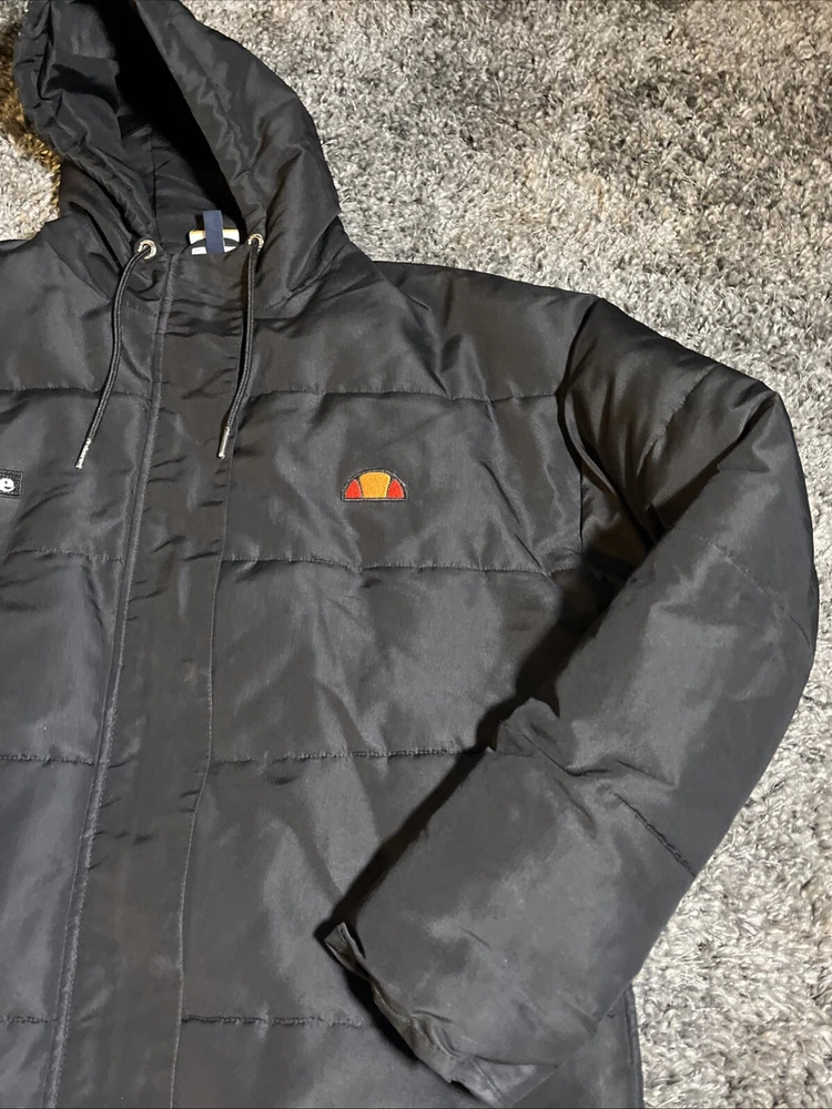 Stay warm and stylish with this black Ellesse Pejo puffer jacket. The jacket features a softshell fabric type with a polyester lining and insulation material, making it perfect for winter, summer, and spring. It has a mid-length jacket/coat length and long sleeves, with a regular fit that accommodates a size 2. This hooded jacket comes with both zip and snap closures, making it easy to wear and take off. It has a solid pattern with quilted accents and the Ellesse logo, giving it a designer and classic outdoor look. The jacket is machine washable, making it easy to maintain. Ideal for travel and casual occasions, this Ellesse Pejo jacket is a perfect addition to your wardrobe.