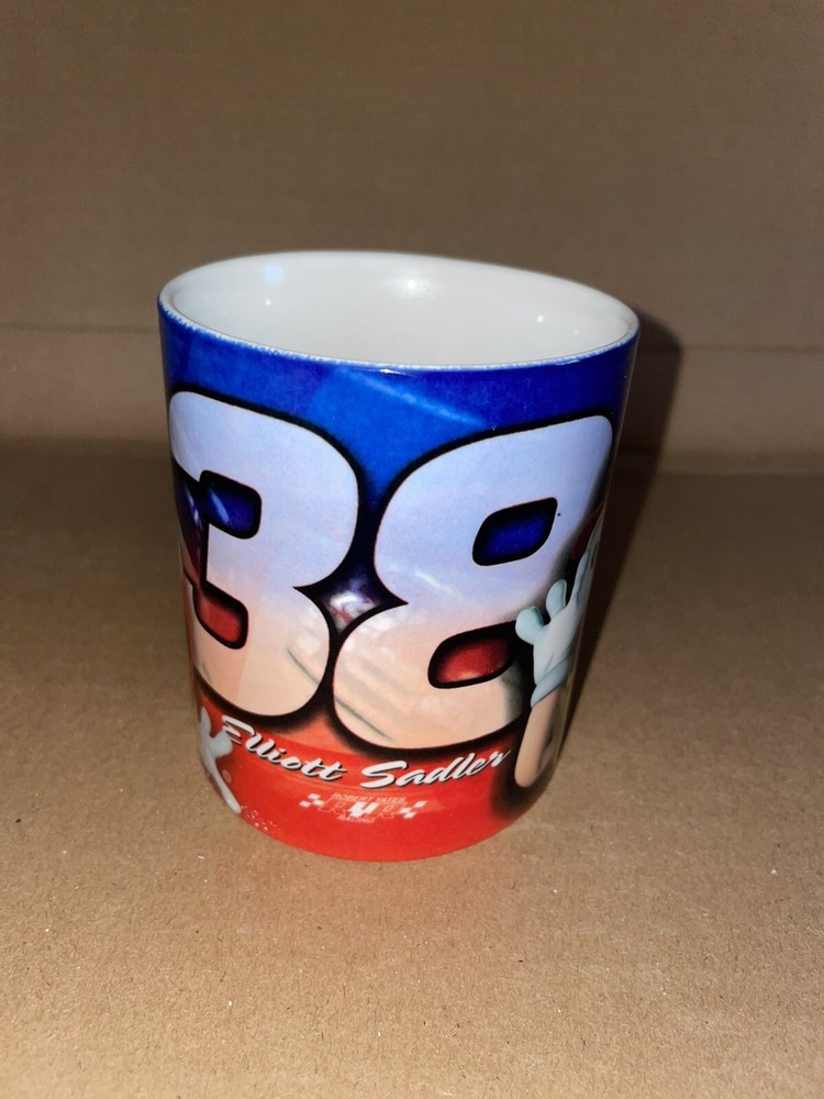 Wake up in the morning to your favorite driver, Elliott Sadler, while sipping on your hot coffee or tea with this NASCAR coffee mug. This collectible M&M's #38 RYR mug is perfect for any NASCAR or Elliott Sadler fan. It features Robert Yates Racing which is a former NASCAR team and NASCAR driver Sadler. This mug is great for everyday use or as a collector's item. Try serving your friends hot cocoa in it during the winter months. Mug is 3 1/4 inches wide and 3 3/4 inches tall. There is some scratches towards the bottom and sticker residue on the bottom of the mug (all as seen in pictures).
