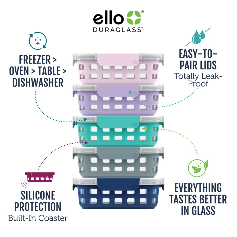 Ello Duraglass 10-Pc Glass Food Storage Container Set with Lids & Silicone Sleeve Food Storage you will want to keep on display! Equip your kitchen with the Ello Duraglass 10 Piece Glass Food Storage Meal Prep Container Set. This Meal Prep Container Set includes (5) 3.4 cup glass food storage containers with leak-proof lids and silicone protection. An extra-thick silicone sleeve protects glass from chips and breaks while the plastic lid is air-tight and leak-proof, keeping food fresher for longer. These containers are leak proof, stain-resistant, and oven safe with the lid off. Ello Duraglass 10 Piece Glass Food Storage Meal Prep Containers are portable and perfect for work lunches and meal prep. This meal prep set allows you to store food for a feast efficiently and easily. All parts are BPA free, microwave safe, and top rack dishwasher safe. Do not place hot containers on wet or cold surfaces. Everything Tastes Better in Glass:The Ello Duraglass 10 Piece Glass Food Storage Meal Prep Container Set is made of odor-free, stain-free, and clean tasting glass Air-Tight Protection: The Ello Duraglass 10 Piece Glass Food Storage Meal Prep Container Set features a leak-proof lid and silicone protection. An extra thick silicone sleeve protects the glass from chips and breaks Easy to Use: Oven and microwave safe without lid. Freezer safe. All parts top rack dishwasher safe. No need to remove sleeve Clean, Safe, Green: All parts are BPA free Peace of Mind: Ello's Lifetime Guarantee protects purchases from authorized retailers All parts dishwasher safe No need to remove sleeve for cleaning Microwave and oven safe without lid - no need to remove sleeve Do not place container on wet or cold surface BPA/BPS Free Shipping Policy FREE SHIPPING in all orders! Orders are usually processed and shipped out after 72 HOURS during BUSINESS DAYS (Monday to Friday) after payment has been received. But please be reminded that we are NOT processing and shipping orders during WEEKENDS and HOLIDAYS. Please make sure your ADDRESS is VALID for both UPS and USPS COURIER SERVICES. Please be reminded that costs incurred due to INCORRECT or UNDELIVERABLE ADDRESS should be shouldered by the buyer. The shipping services that we use are UPS, FedEx, USPS etc. We ONLY ship to the 48 STATES, NO APO/FPO ADDRESSES or PO BOXES. We DO NOT ship to warehouse, freight company. Local pickups and combined shipping options are NOT provided at this time. Return Policy DOMESTIC RETURN ACCEPTED - 30 DAYS. Contact us for more information. Payment Policy We accept payment by any of the following methods: PayPal Items can be returned for exchange or full refund WITHIN 30 DAYS from the date you receive your merchandise. We are not responsible for any purchase after this 30-day period. Feedback & Contact Us Customer satisfaction is very important to us. If you have any problem with your order, please contact us and we will do our best to make you satisfied. If you have any queries, please contact us via Ebay. We usually respond within 24 hours on weekdays. Thank you for shopping at our store.