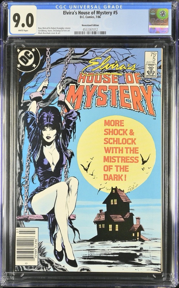 Variant Type:Newsstand VariantUniverse:DC UniverseStyle:ColorUnit of Sale:Single UnitProfessional Grader:Certified Guaranty Company (CGC)Format:Single IssueCharacter:ElviraVintage:YesType:Comic BookCountry of Origin:United StatesSigned:NoPublication Year:1986Personalized:NoInscribed:NoSeries Title:Elvira's House of MysteryLanguage:EnglishEra:Copper Age (1984-1991)Grade:9.6 Near Mint+Intended Audience:General AudienceTradition:US ComicsArtist/Writer:Joey Cavalieri, Robert KanigherPublisher:DC Comics