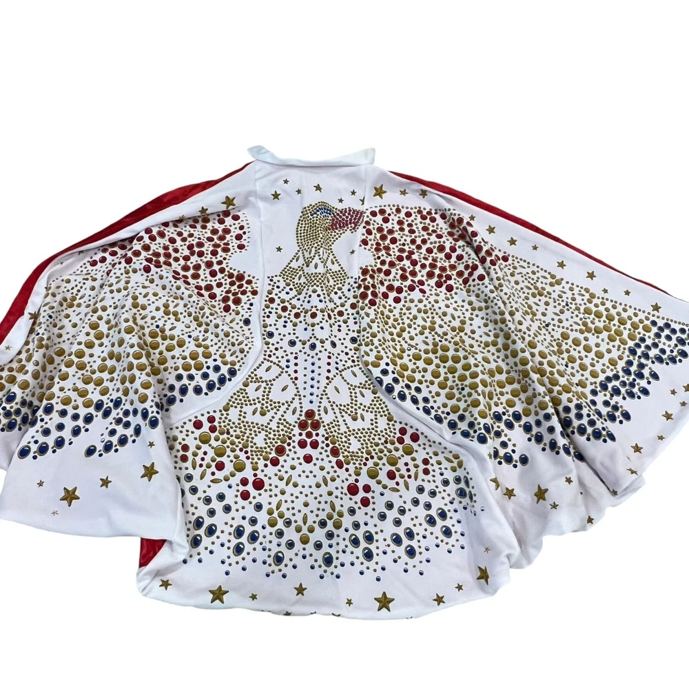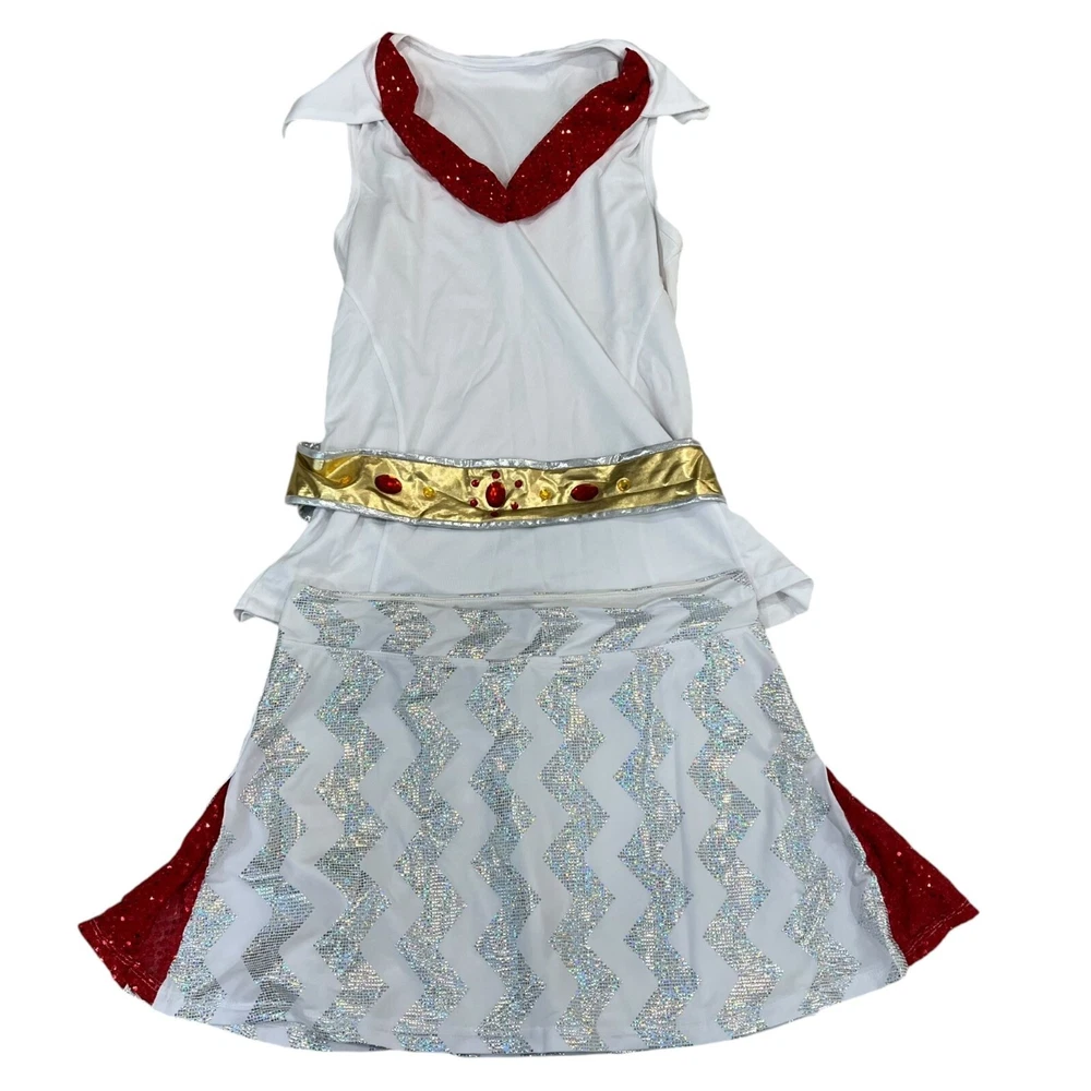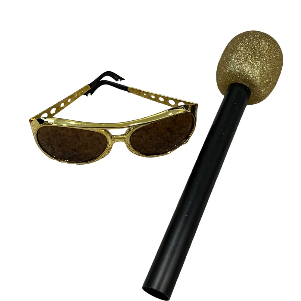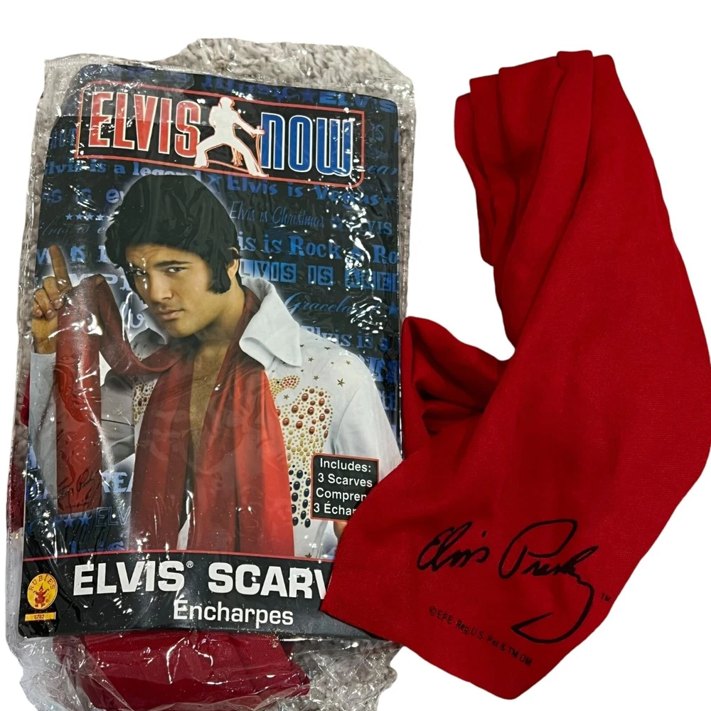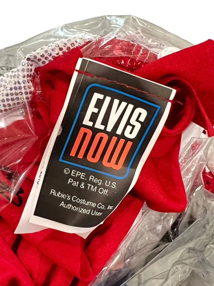 Unleash your inner King of Rock 'n' Roll and channel Elvis in this hilarious costume set. Includes everything you need to rock the stage and steal the show. Just don't be surprised if you start craving peanut butter banana sandwiches. • Includes wig, glasses, scarf, & microphone • Signature Elvis red scarf with print • Gold and red sequined belt • Adult size costume set - One size fits most (no size tag) Size: Womens OS Condition: Pre-Owned Like New