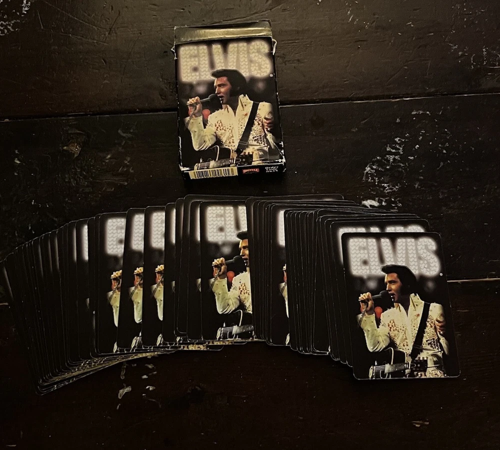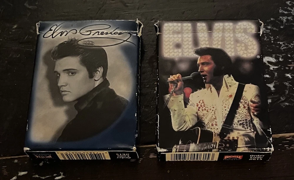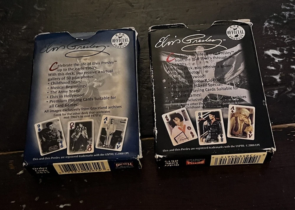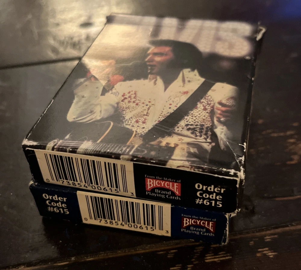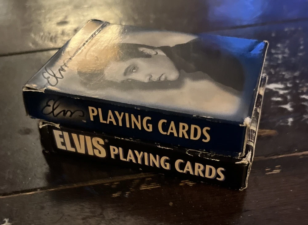 Elvis Presley Playing Cards 2 Bicycle Decks Photos 60s 70s Graceland Archives. Good preowned condition showing normal signs of wear/use. The cards are all in good shape with no issues. The covers show some shelfware. Two complete sets. There are no jokers. Please see photos for design and condition details. Don’t hesitate to message me with any questions.