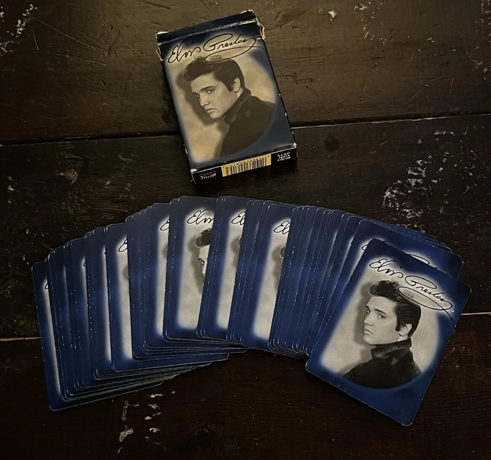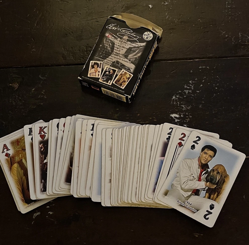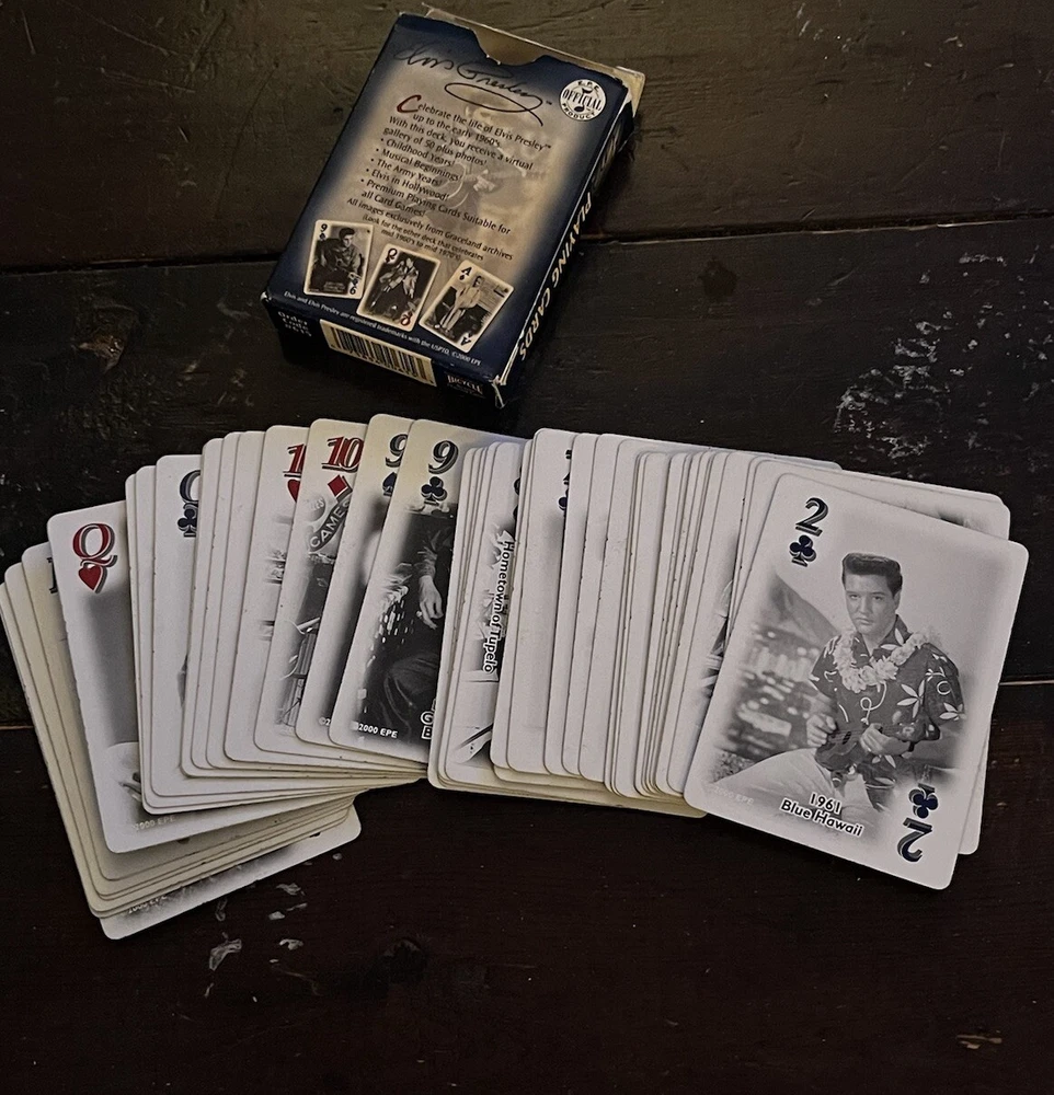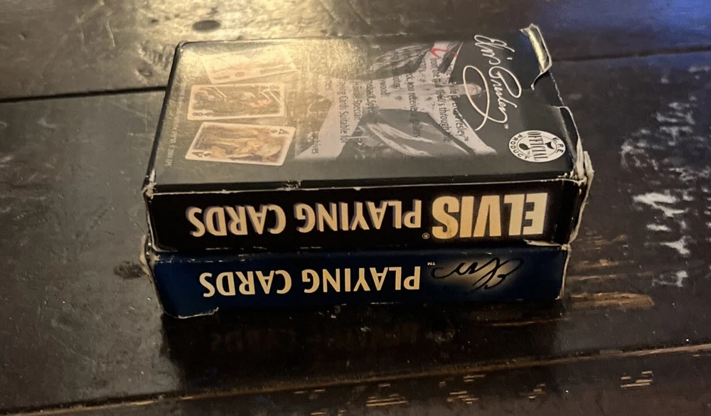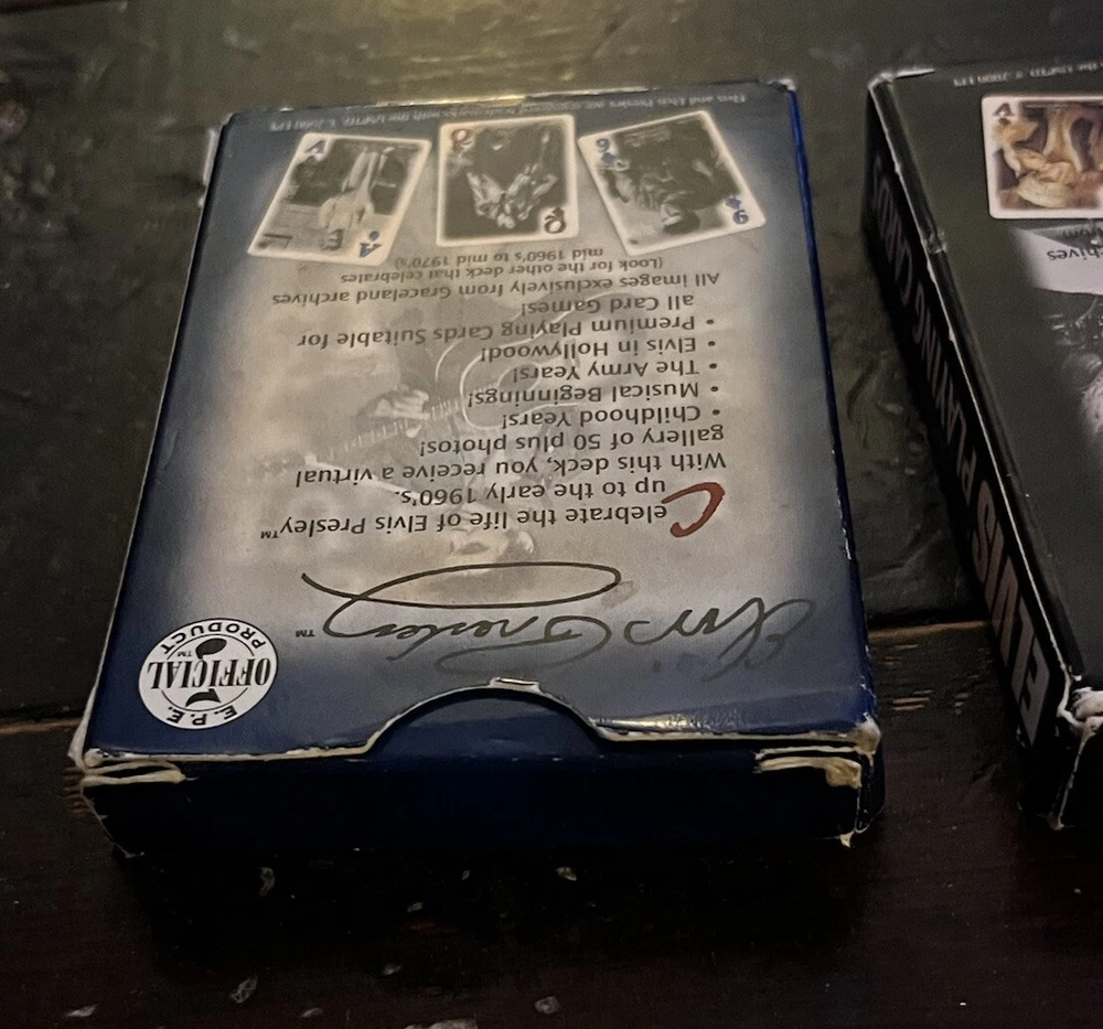 Elvis Presley Playing Cards 2 Bicycle Decks Photos 60s 70s Graceland Archives. Good preowned condition showing normal signs of wear/use. The cards are all in good shape with no issues. The covers show some shelfware. Two complete sets. There are no jokers. Please see photos for design and condition details. Don’t hesitate to message me with any questions.