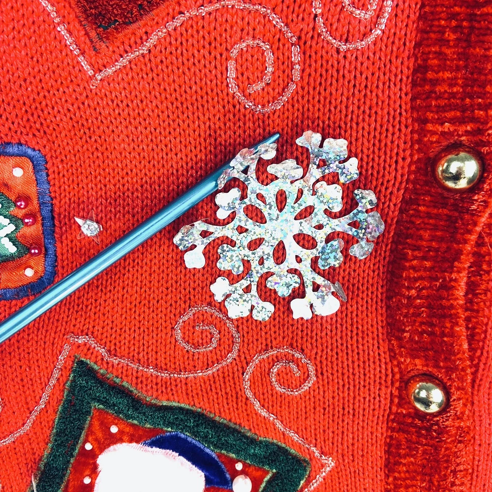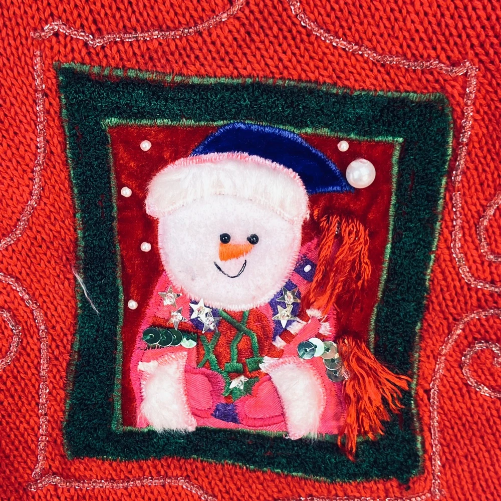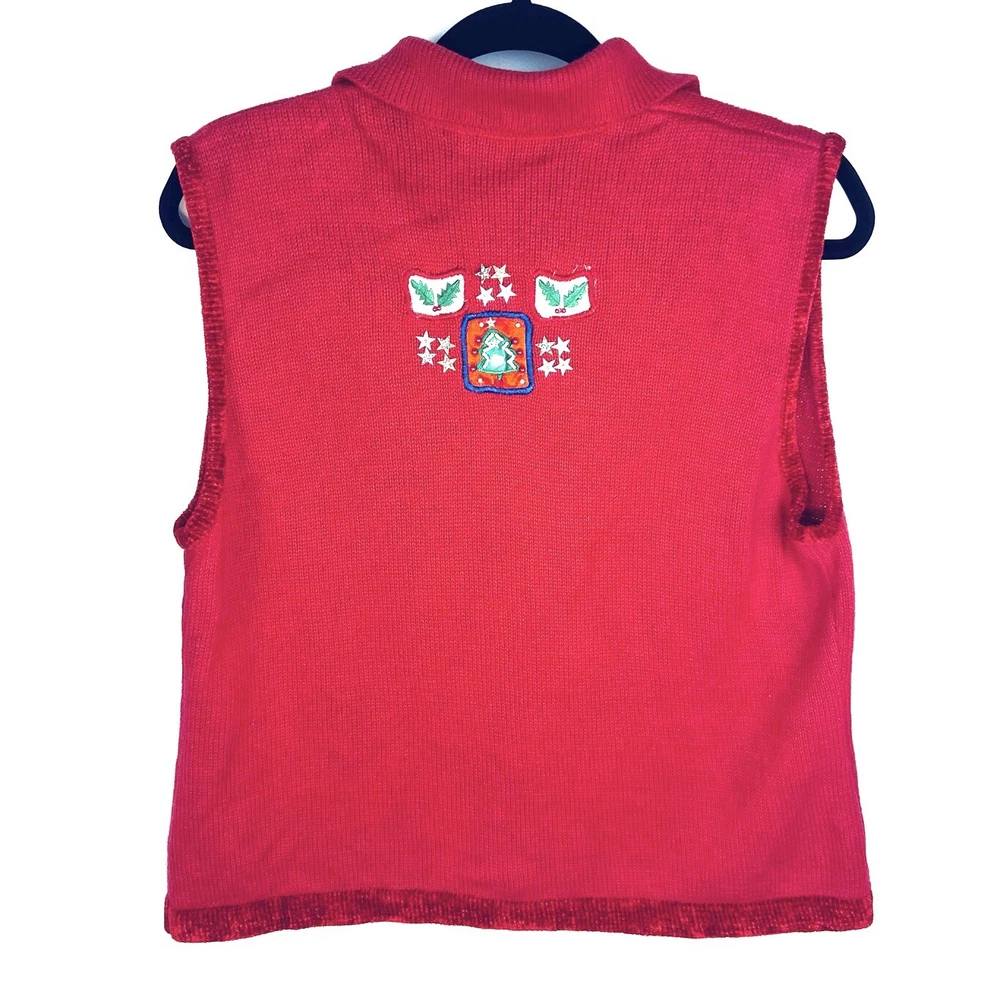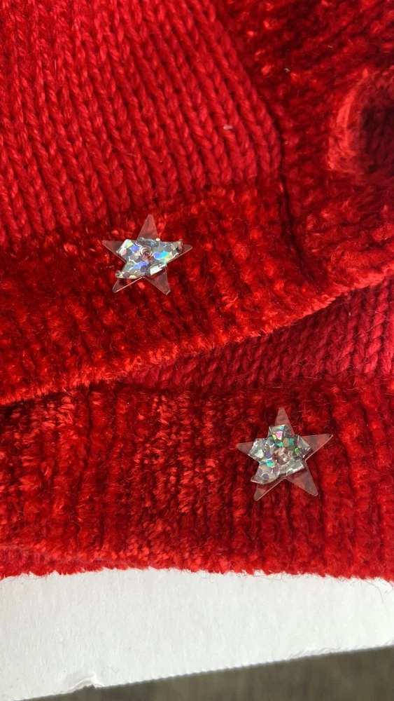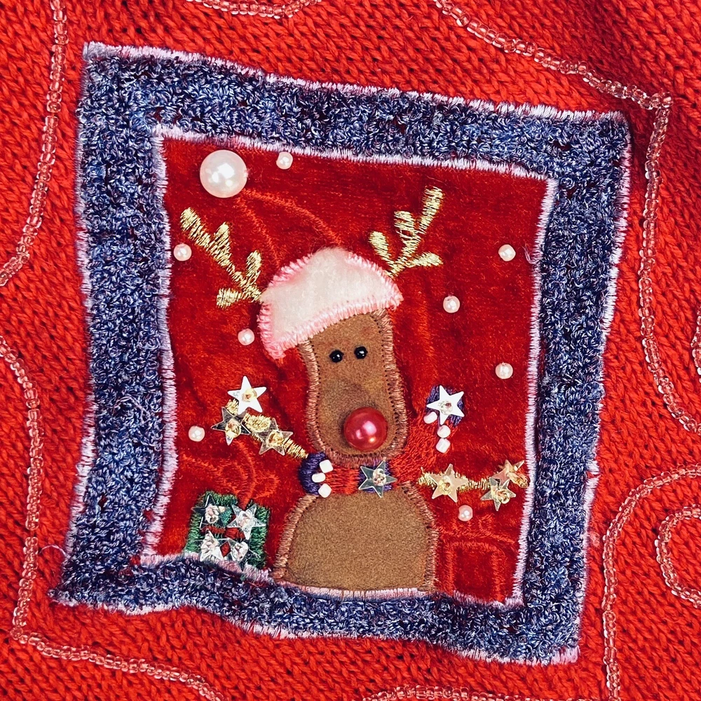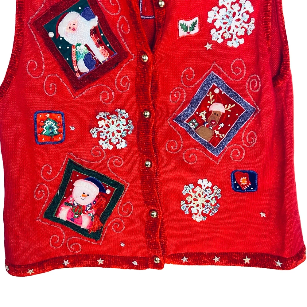 Christmas vest cardigan with gold buttons and embellished with embroidery, beading, snowflakes and stars. A cozy velvet like red trim is around arm holes, button placket, and hem. This sweater features "snapshots" of Santa, Snowman, and Rudolph. There are buttons on the inner collar to attach a fur collar - which is missing. Condition/Info: This is a pre-owned item. One of the snowflakes has edges lifting up and needs some fabric glue. Two of the tiny stars along the hemline are peeling. See last 3 photos before tag pictures. Detachable fur collar is missing. No holes, stains, or tears seen. View all pictures carefully as they are part of the description. Color in pictures may be different in person due to lighting. Size: PXL Color: Red Material: Cotton/Ramie blend Style: Sweat vest, cardigan. Boxy, short. Handwash MEASUREMENTS (approximate laying flat): Shoulder to shoulder: 16.5" Underarm to underarm: 20.5" / 41" circumference Hem opening: 21" / 42" circumference Length from bottom of collar to hem: 22" 🍄Thanks for looking! ⭐Smoke and pet-free ⭐Examine photos carefully as they are part of the description. ⭐Ships quickly - same or next business day! #Bling #Embellished #Uglychristmassweater #Christmasparty