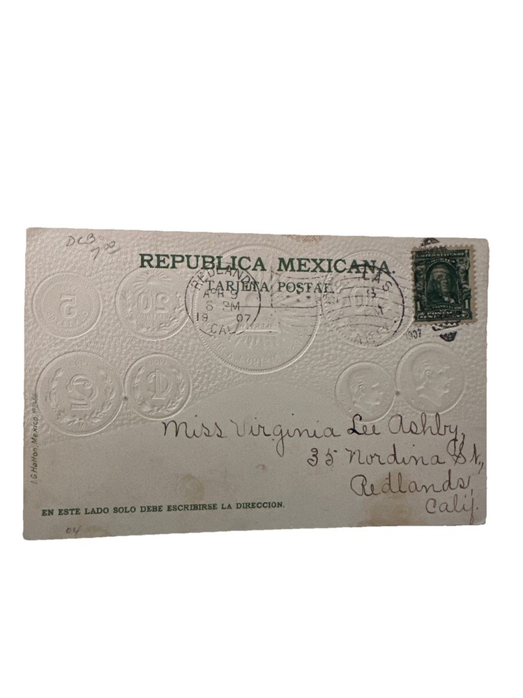 This vintage postcard features an embossed design of Mexican national flags and coins, representing currency from the Republica Mexicana. Manufactured in 1910 by Bavaria, this postcard captures the theme of coins and money, showcasing a piece of history from the early 20th century. The postcard is an original print from Germany, measuring a standard size of 5.5 x 3.5 inches, and is a unique addition for collectors interested in non-topographical postcards. Please look at all photos, and feel free to ask me any questions. I have many other passes take some time to look at my other items.