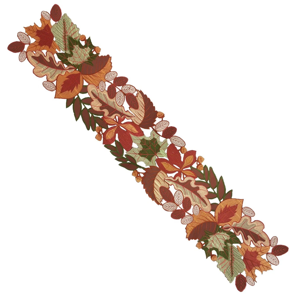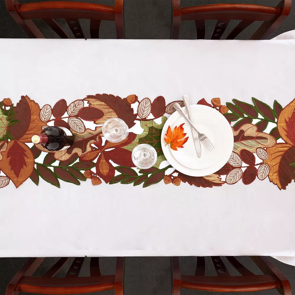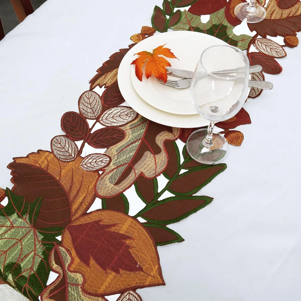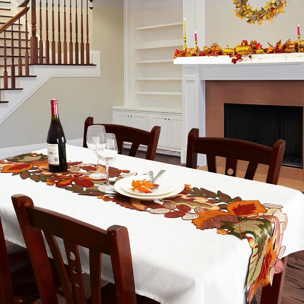 Embroidered Fall Autumn Thanksgiving Leaves Table Runner (14 × 34 Inches)