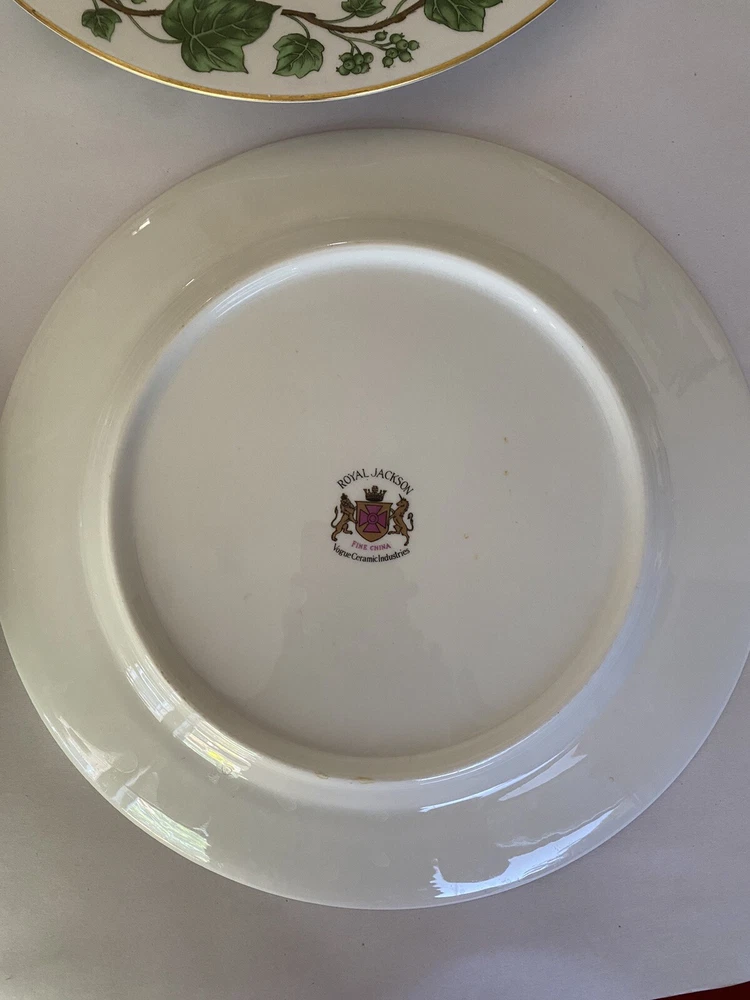 Occasion: All Occasions Theme: Ivy Production Technique: Studio Crafted Material: Bone China Era: Mid 20th Century (1941-1969) MPN: NA Number of Items in Set: Four-Piece Brand: Royal Jackson Year Manufactured: 1951 Original/Licensed Reproduction: Original Manufacturer Warranty: No Product Line: Emerald Ivy Department: Adult Set Includes: Dinner Plate, Plate Type: Dinner Plate Time Period Manufactured: 1950-1959 Pattern: Ivy Finish: Glossy Production Style: Glass Backstamp: Printed Color: White Green Style: American Directoire Item Weight: 2.2 lb Handmade: No Features: Decorative Vintage: Yes Plate Diameter: 10 1/4” Shape: Round Origin: America Country/Region of Manufacture: China Antique: Yes