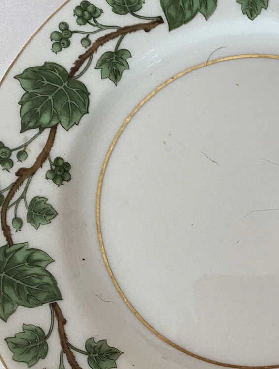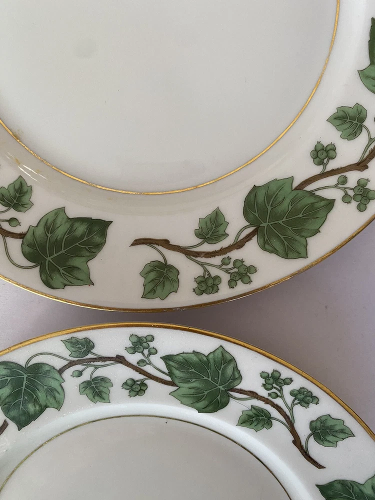 Add a touch of elegance to your dining table with this set of four dinner plates from Royal Jackson. The Emerald Ivy pattern features a glossy finish and a beautifully crafted design in white and green. The plates are 10 1/4" in diameter and are perfect for all occasions, whether you are hosting a formal dinner or a casual gathering with friends. These vintage plates are from the mid-20th century and were produced using studio crafting techniques in China. They come with a printed backstamp and weigh 2.2 lbs each. The set includes both dinner plates and regular plates, making it ideal for complete table settings. The American Directoire style and the Ivy theme make these plates a great addition to any collection. Good condition 10 1/4”