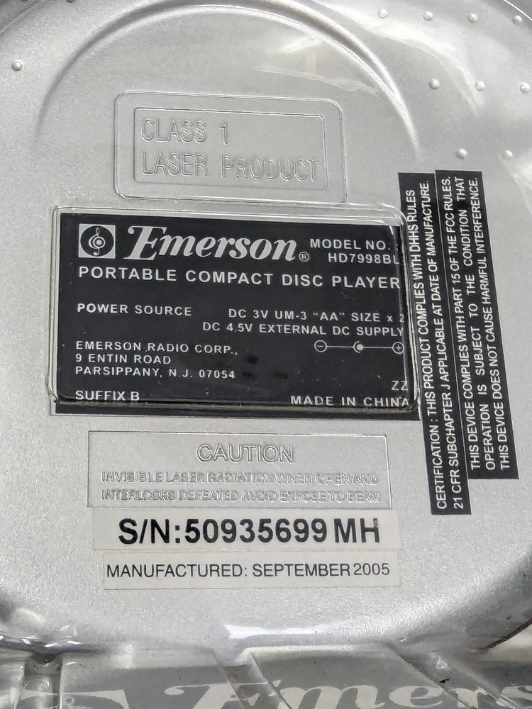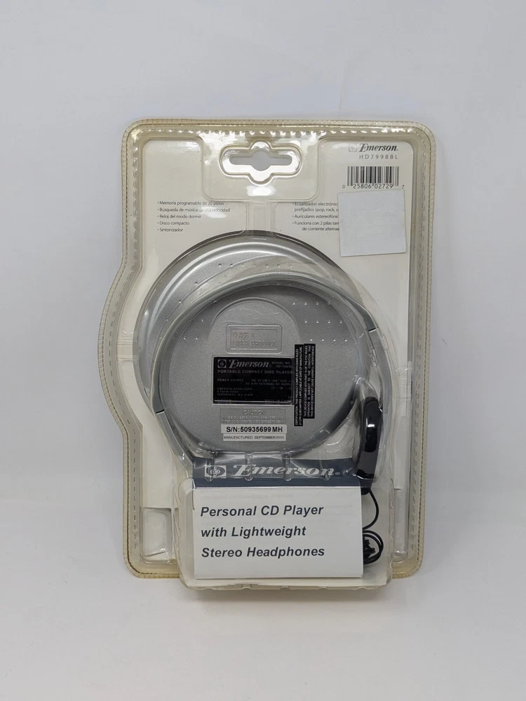Brand: Emerson Features: Headphone Jack Color: Blue Model: Emerson HD7998BL MPN: HD7998BL Type: CD Player Playable Media Format: CD gtin13: 0025806027297 UPC: 0025806027297 CD Changer Capacity: 1