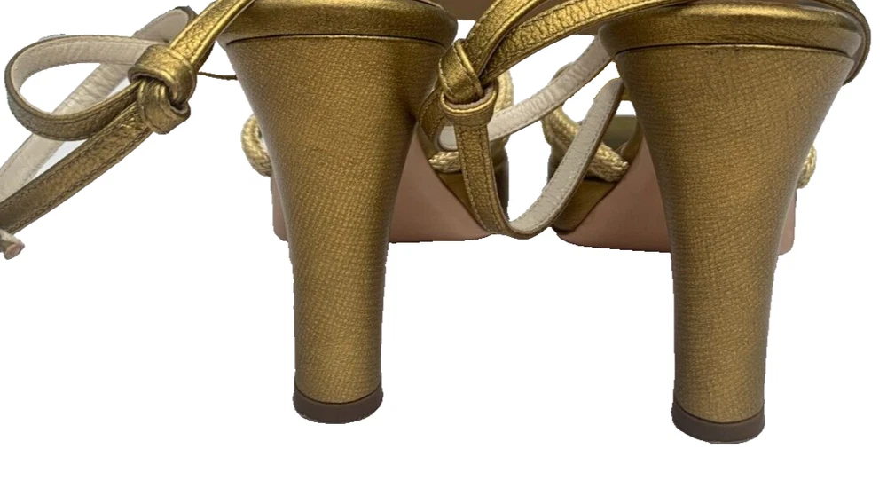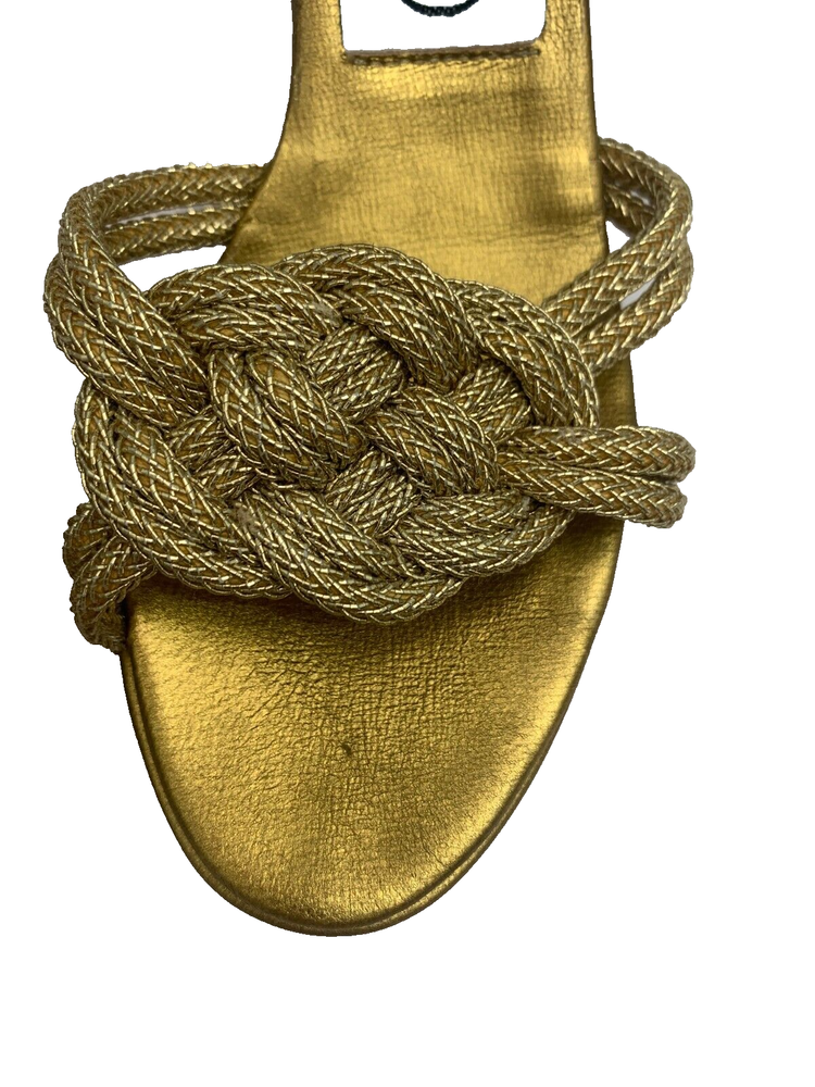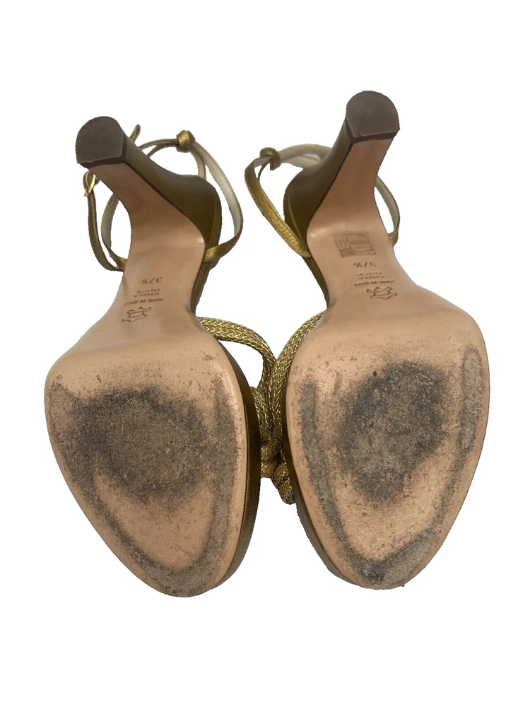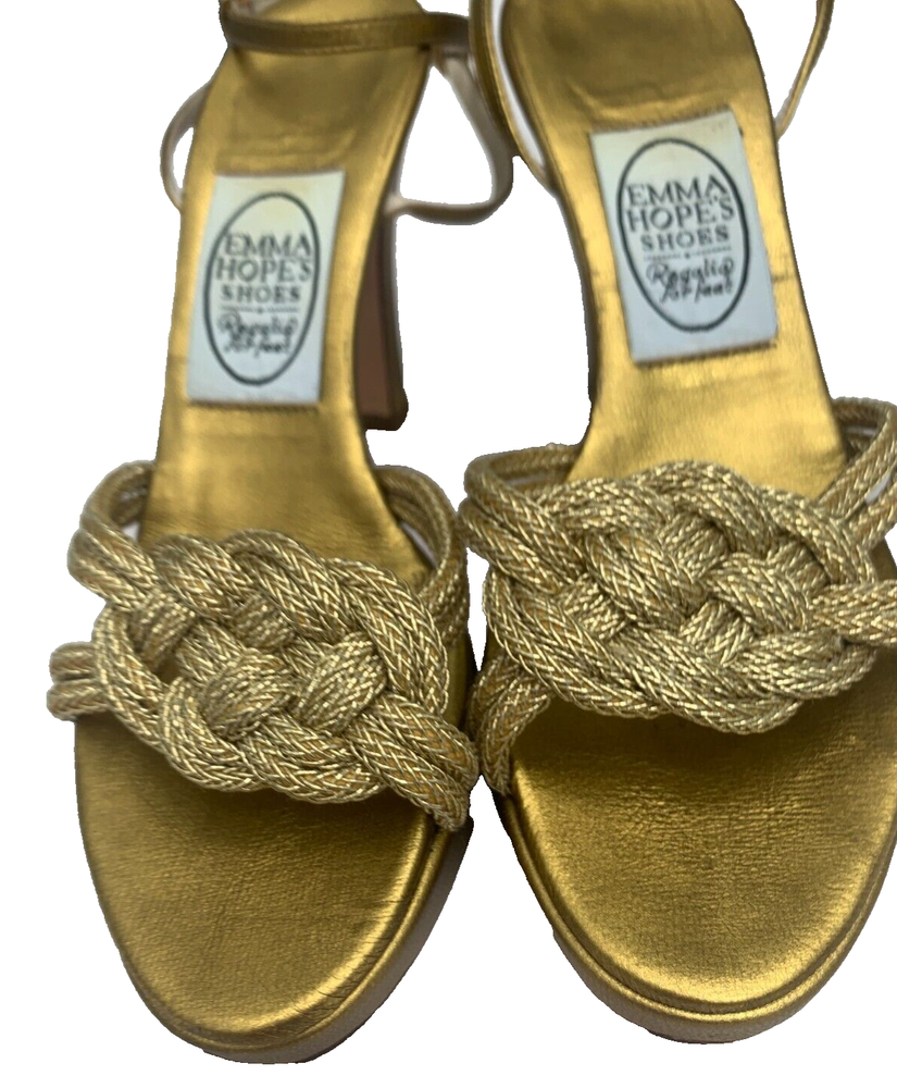 Elevate your style with these stunning Emma Hope gold platform heels. Crafted with metal rope detailing, these shoes are a regal addition to any outfit. The size 37.5 EU ensures a perfect fit for a touch of glamour and sophistication. Made for the modern woman who values both fashion and quality, these heels are a must-have for any wardrobe. These will be posted in their original box with an Emma Hope's Shoes cloth bag as well the the sandals.