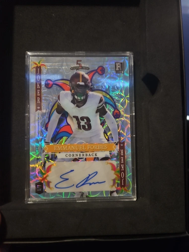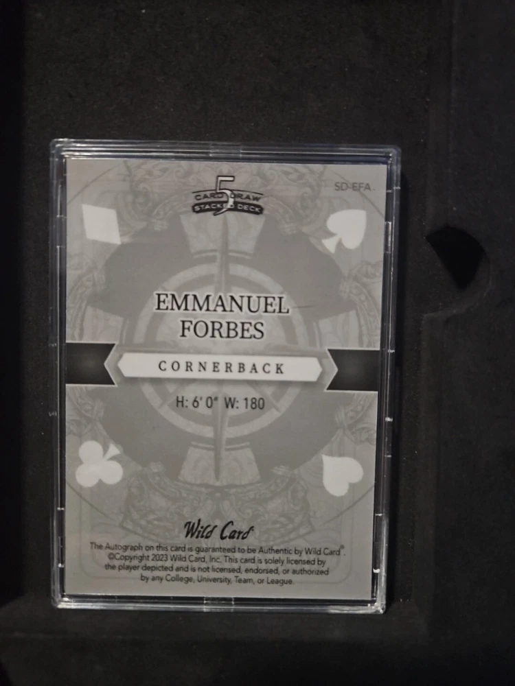 The product is an autographed 2023 Wild Card 5 Card Draw trading card featuring Washington Commanders player Emmanuel Forbes. This one-of-one rookie card (#SD-EFA) is in near mint or better condition and is from the National Football League (NFL). It is a unique collectible item for fans of the sport.