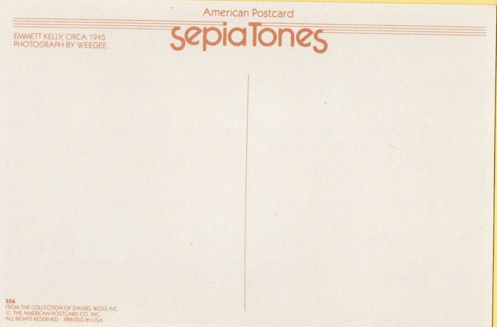 Emmett Kelly, American Postcards Sepia Tones. Postcard, Photograph by Weegee Circa 1945. Printed 1980's 4"x6" Continental Size. No specific date of production is printed on this card. All American Postcard company postcards were produced between 1979-1993. All postcards are NOS unposted. All cards I am selling are considered New Old Stock and have been stored in stacks unless specifically mentioned. Vintage postcards and greeting cards may have small differences I.E; yellowing of paper, worn edges, corner blunting. Basic wear from storage of vintage cards. I will always send the best quality card I have. The picture is of a postcard like the one you will receive not necessarily the one you will receive. Unless I have previously specified. I will never send a bent, ripped or damaged card unless specifically mentioned. I always inspect every item I send out for quality and ship the items with care, shipping items how I would like to receive an item. Please message me with any questions or concerns. This card is not available for bulk purchases.