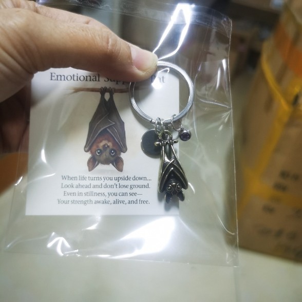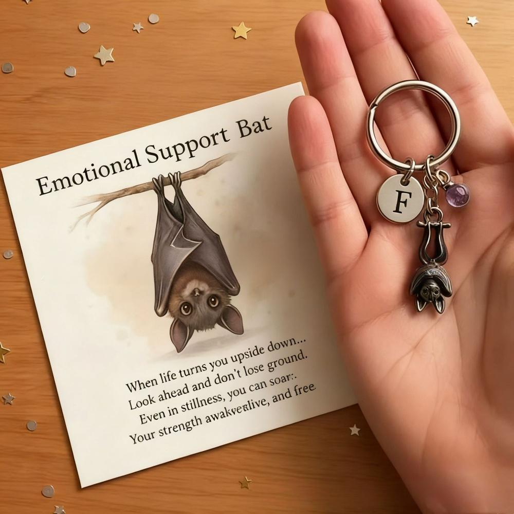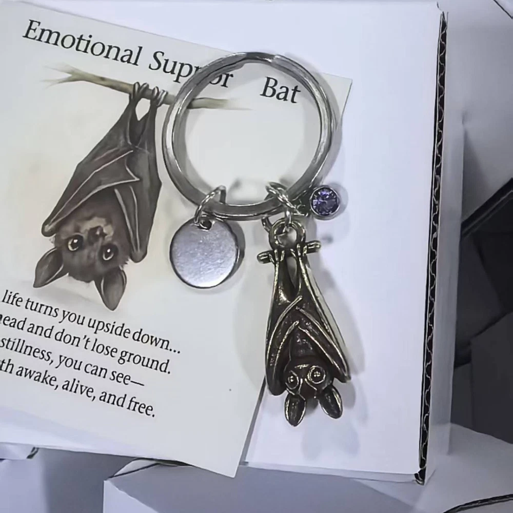 Product Description Emotional Support Bat-Themed Inspirational Keychain, Metal Bat Pendant, Come with An Inspirational Poem Card About this item 【Inspirational Bat Design, Emotional Support Partner】This bat keychain is inspired by maintaining inner peace during life's ups and downs. Shaped like a hovering bat, it symbolizes clarity, strength, and resilience, reminding you or someone you care about that even in difficult times, your inner strength remains vibrant. 【Complete Set Includes Inspirational Poem Card】Each keychain comes with a beautifully illustrated card bearing the uplifting words: "When life turns upside down…your strength is clear, vibrant, and free." This heartfelt gift offers immediate comfort when you need encouragement. 【Thoughtful Design Details】The metal bat pendant vividly captures the biological characteristics of a bat, its expressive shape pleasing to the eye. Purple accents add a touch of softness to the sturdy metal, creating a healing aesthetic that perfectly blends symbolism and artistic beauty. Perfect for hanging on keys, bags, or wallets. 【Durable, High-Quality Materials】Made from durable, fade-resistant metal, ensuring it stays looking new for years to come. High-quality paper cards in vibrant colors ensure the keychain and card remain beautiful with daily use, becoming a constant source of inspiration. 【A Little Energy Station, A Thoughtful Gift】Hang it on your keys, bag, or accessories to remind yourself to stay confident during overtime, busy daily life, or moments of confusion. Give it as a warm gift to someone going through challenges, letting this symbolic bat silently convey the message, "I see your strength."