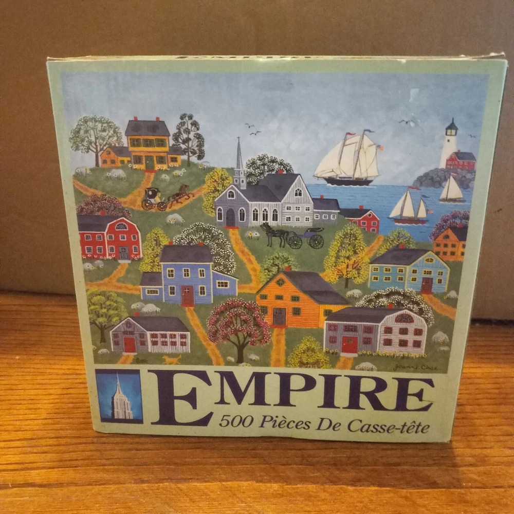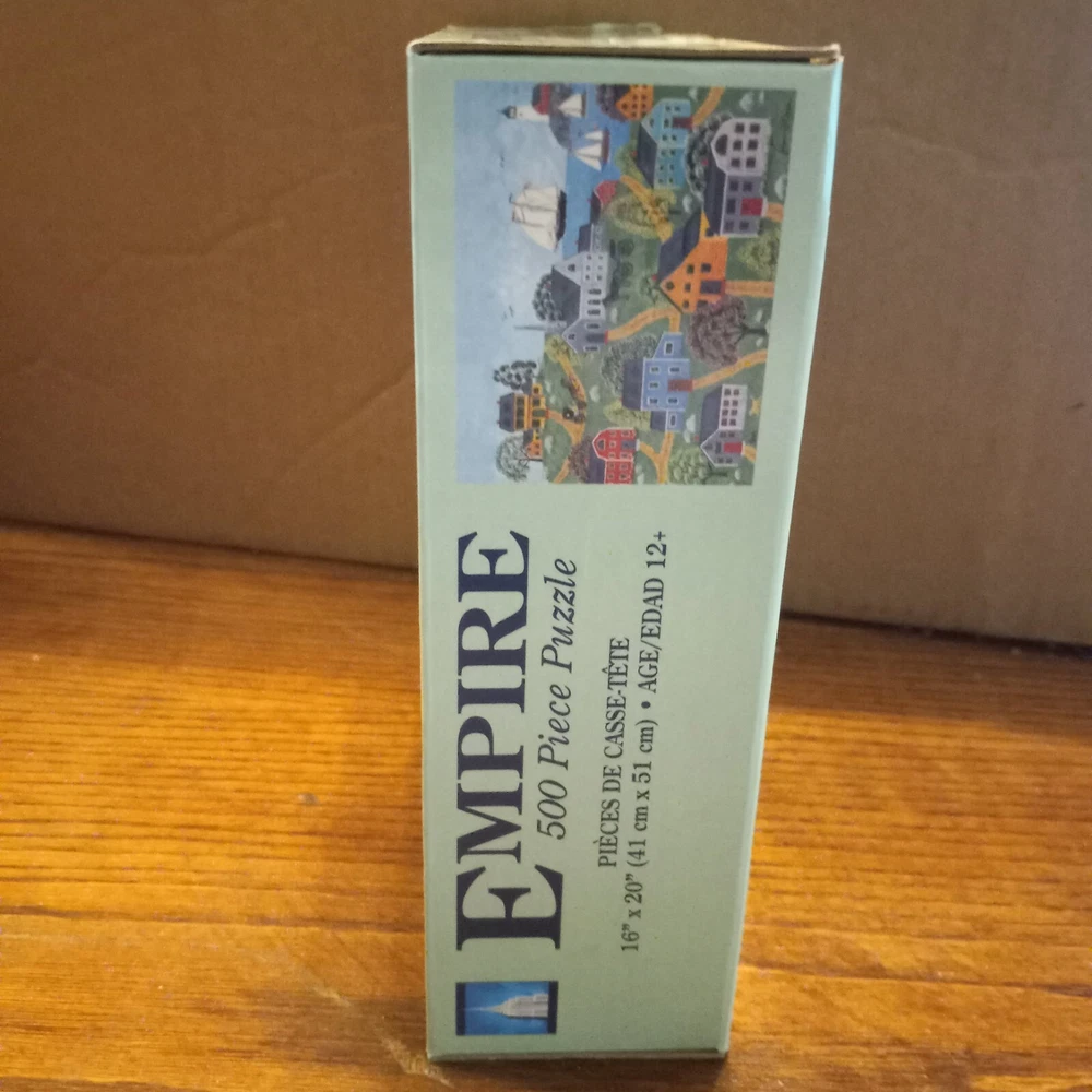 Empire Puzzle Makers By The Cove 500 Jigsaw Puzzle Brand: Empire/Puzzle Makers Design: By The Cove Color: Multi-Color Pieces: 500 Features: Cardboard Size: 16"x 20" Includes: Puzzle Pieces, Poster, Box Used Condition Complete Box Shows Wear - Tape On Edges, Box Damage