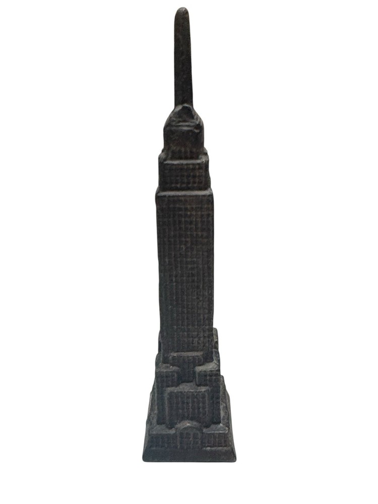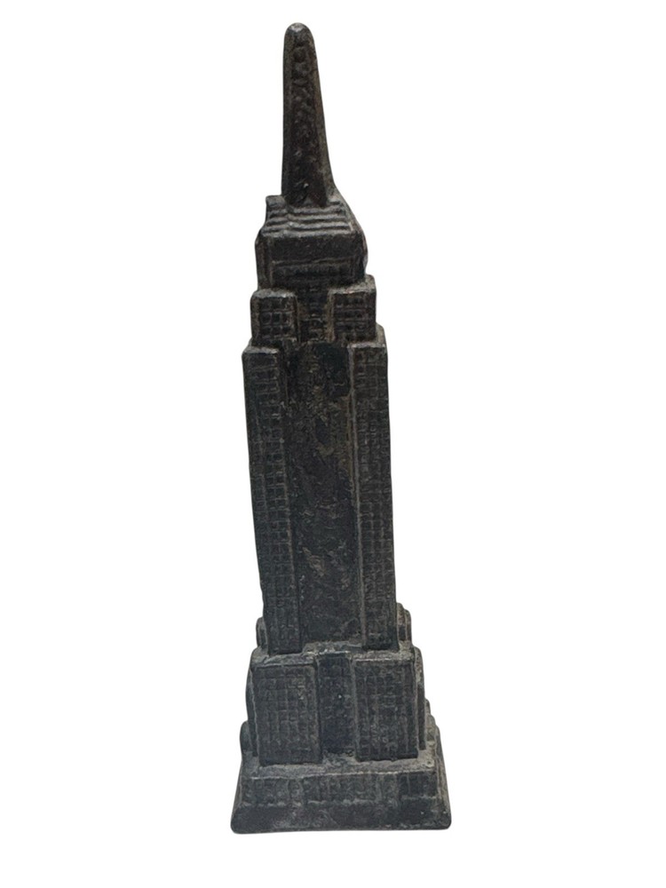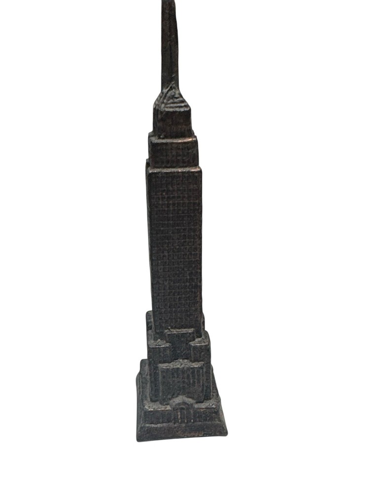 Miniature Empire State Building souvenir statue featuring a detailed textured exterior in a dark metal finish. A great collectible for NYC enthusiasts, architecture lovers, or travel memorabilia displays. Measures approximately 4 inches tall. Pre-owned in good condition with light surface wear consistent with age.