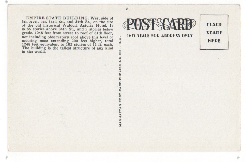 Empire State Building New York City NY Divided Back 1907-1914 Postcard Manhattan Post Card Publishing Co. All my postcards are in previously owned vintage condition - some are postally used with stamps / postmarks. Please see all scans as they are part of the condition description. Various conditions including soft / chipped corners or edges, creases, stains, pencil / crayon marks, or tears. Expected age/use wear.