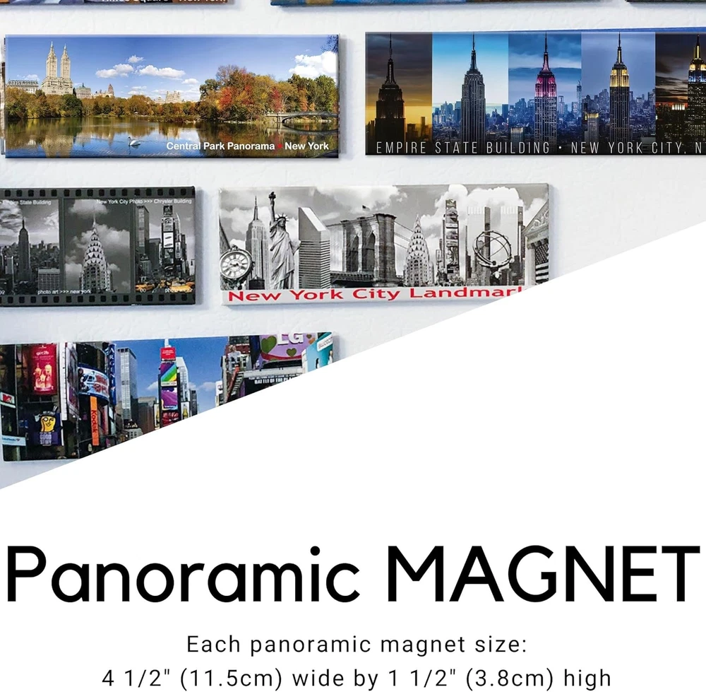 PHOTOGRAPHIC MAGNETS - Stunning photographs and vibrant colors! Our NY magnets will bring the beauty of this lively city into your home. "New York, New York" is a collection of panoramic cityscapes and artsy shots, printed on magnets that make cute gifts and keepsakes for art lovers COLORFUL AND COLLECTIBLE - This is a filmstrip of photos taking at different cast and time points. The beauty of Statue of Liberty at night, sunset and dusk will add a sofisticated touch to your fridge and make great personal or corporate gifts. KEEPSAKE SOUVENIRS - Preserve your memories of wild times in the city that never sleeps! Our NY refrigerator magnets will keep New York on your mind while adding a chic decorative touch to your living space HANDY HOME ACCESSORIES - Use our New York refrigerator magnets to display memos and reminders in full view, to keep bills and receipts together, or for showcasing your own NYC vacation photos QUALITY GUARANTEED AND NO QUIBBLE RETURNS - Each 4 1/2 x 1 1/2-inch magnet is made of high-quality rigid metal with a full-size magnetic back. They're professionally printed on special film in vivid colors, then laminated for protection and color enhancement. Want to bring home a part of ol' New York? Our magnets make it easy! Let's hear it for New York... the city so awesome they named it twice - "New York, New York!". A city that is never sleeping is captured in incredibly artistic photographs on these quality NYC magnets from NY Poster “New York City Landmarks” collection. From Brooklyn Bridge to Lady Liberty, Central Park to Midtown Manhattan, Times Square to Little Italy - all the most famous landmarks and sites are represented in glorious shots taken by Igor Maloratsky. Igor Maloratskiy is a local, well-known photo artist and his portraits of the NY cityscapes featured on Art Prints, Cards, and Souvenir Magnets. Hi was capturing New York landmarks and impressions of this incredible city for the last 25 years and best shots from his art collection now featured on NYC Magnets. Any Photo Magnet from our NY Gifts Collection will make a classy corporate gift, stylish souvenir, and cool keepsake. Furthermore, our magnets are also an easy way to tap into the trend of NYC-inspired home décor. Your purchase is covered by the Amazon Guarantee and our no-questions-asked returns policy. Add your favorite photo magnet featuring famous New York City Landmark to your cart now for an instant New York state of mind!