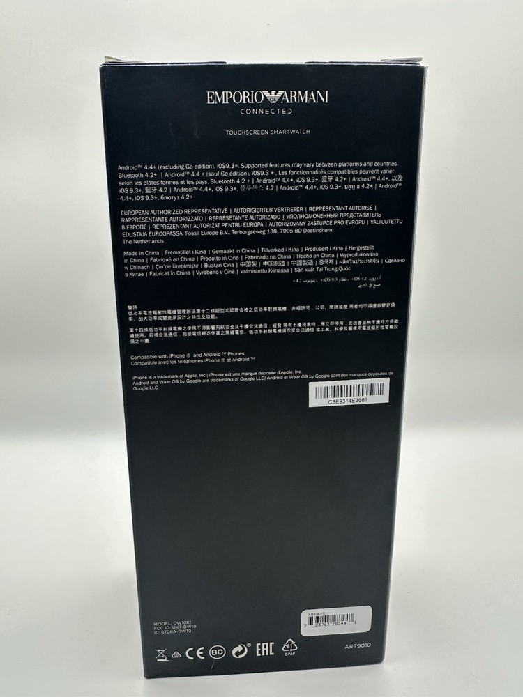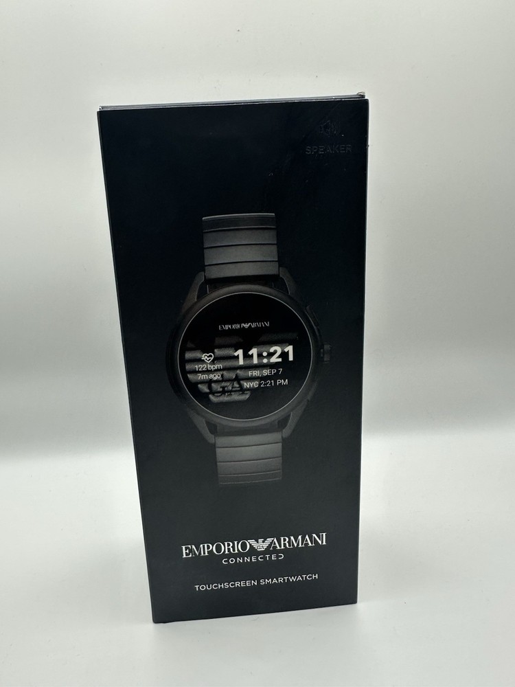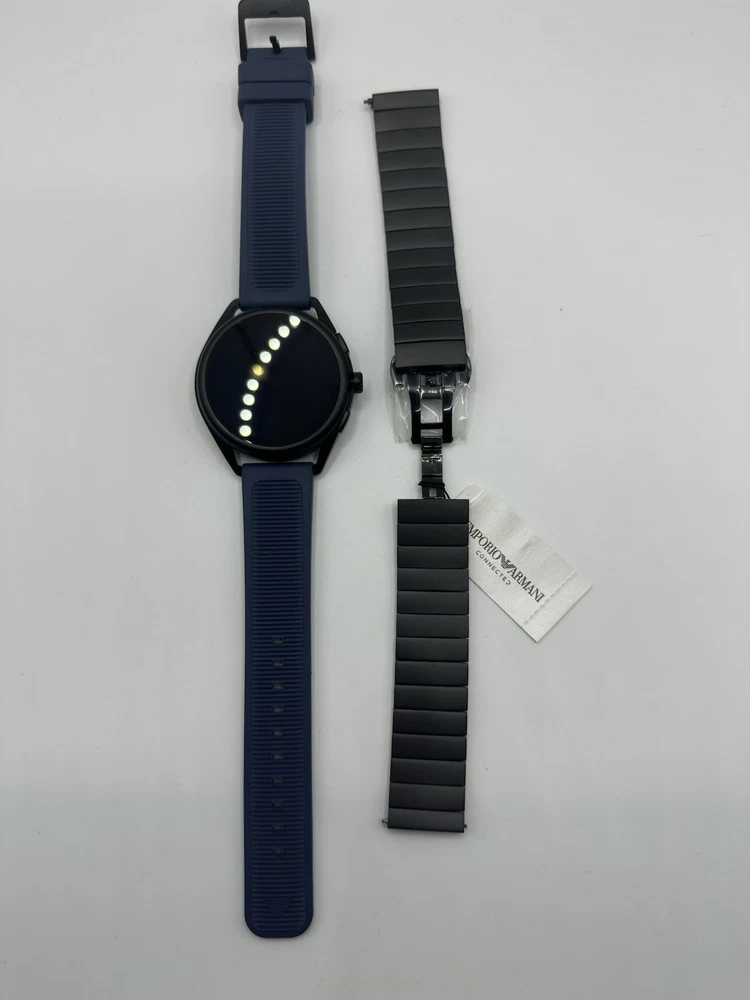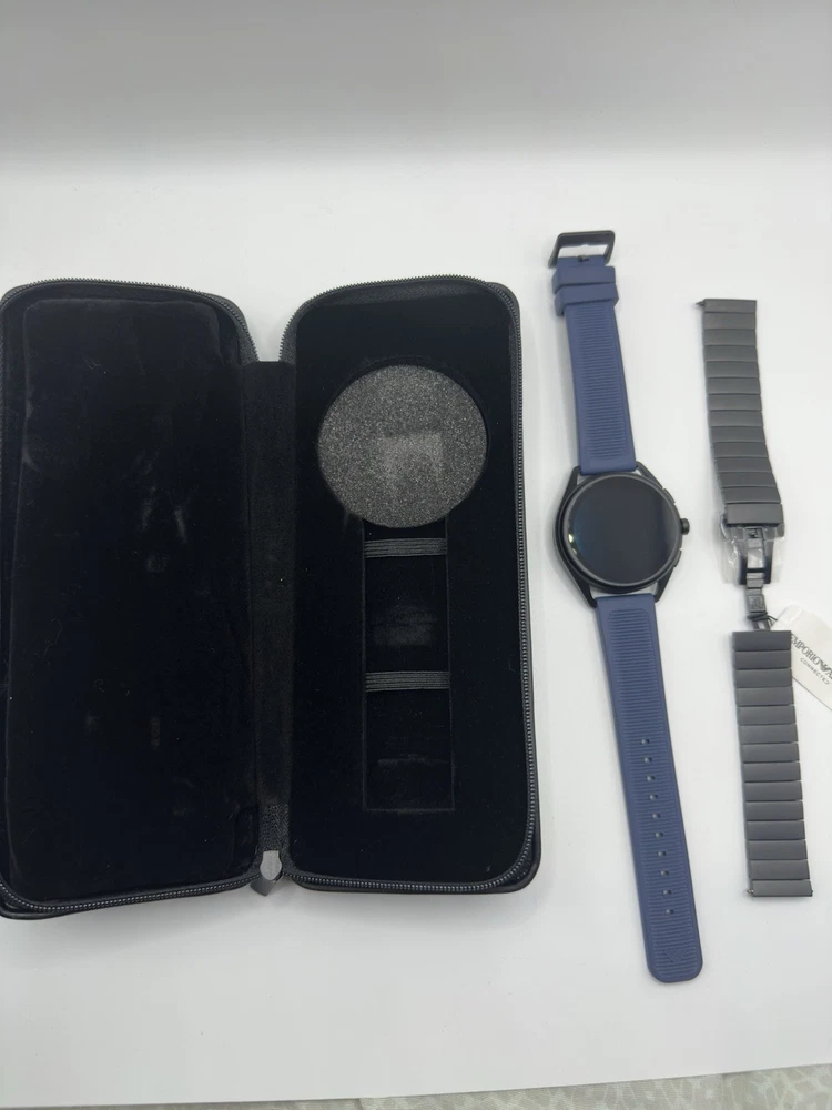 COMES WITH EVERYTHING SEEN IN PICTURES . QUESTIONS? DM Me! The Emporio Armani Smart Watch Touchscreen is a stylish and high-tech timepiece that combines fashion with functionality. With a sleek blue case and black rubber band, this smartwatch is designed for those who appreciate both style and technology. It features a 44mm case size and runs on Wear OS, making it compatible with iOS and Android devices. Packed with features like a fitness tracker, touchscreen, Bluetooth connectivity, and more, this smartwatch is perfect for those looking to stay connected and active on the go.