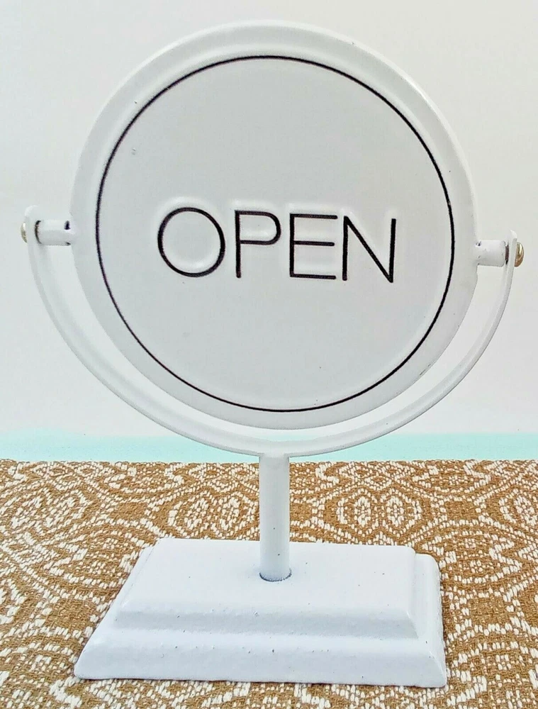 Open/Closed Enamel Flip Sign on Stand White with Black Letters Iron Metal 7.5"T. Sign can be flipped for Open and Closed sentiments. Measurements are approximately 7.5" tall. It is a free standalone sign. Condition is Brand New/Unused. If you have any questions or concerns, please contact us. Please check out The Burly Owl Lady eBay store for more home decor goodies! Shipped USPS. We ship vintage and new items. We carefully pack with care to ensure the safety of each item. We do not pass these packaging costs onto the buyer. Furthermore, we do not charge any extra fees for handling. We only charge for the USPS shipping charge. We do monitor shipping prices frequently. In most cases, we do find the USPS to be the most inexpensive way to ship our products. We try to be as detailed as we possibly can in our photos and descriptions. We try to mention any imperfections in our vintage items. We may miss things from time to time or our photos may not be enough clarification for you to see the item. We will be glad to answer any questions or send you more photos. If at any time, you have a question or issue, please contact us immediately. We will contact you within 24 hours. We want to make sure you have a good experience in purchasing any of the products. If you are happy with your purchase, please leave feedback. It will help us to grow and offer more great items in our store! Thank you for your interest in one of the many products in our eBay store! Renee Burly Owl Lady