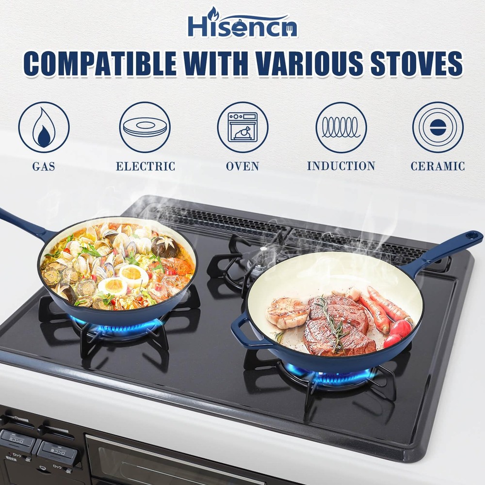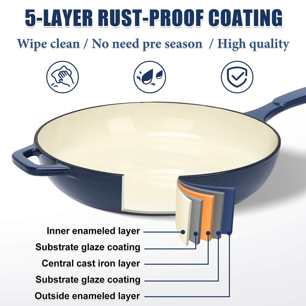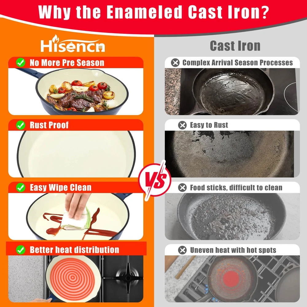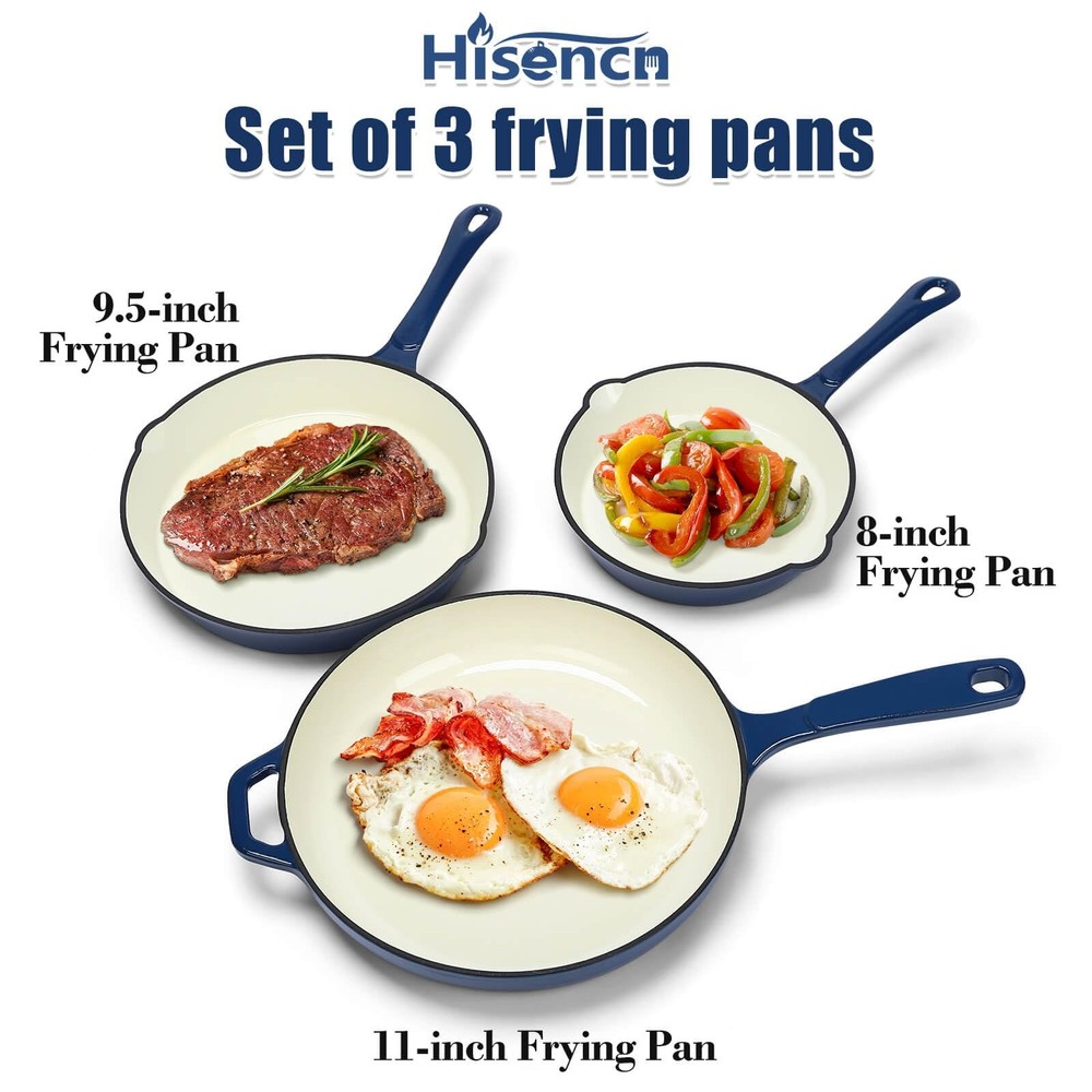 Experience Superior Cooking with 's 3-Piece Enameled Cast Iron Frying Pan Set Elevate your culinary skills with our premium quality cookware set, meticulously crafted for exceptional performance and durability. Whether you're sautéing, grilling, slow cooking, frying or roasting, this versatile set is your ultimate kitchen companion. What's in the Box: 8-Inch Skillet 9.5-Inch Skillet 11-Inch Skillet An excellent gift choice for cooking enthusiasts! Premium Quality: Crafted from durable cast iron. Non-Stick Enameled Coating: Cleanup is a breeze with the non-stick coating, which is free from PFOA, PTFE, lead, and cadmium, ensuring healthy cooking. Versatile Cooking: Compatible with gas cooktops, electric, induction, and ceramic stoves. Oven safe up to 550 degrees Fahrenheit. Cleaning and Maintenance: Simply use a soft sponge or rag for cleaning. Avoid using metal utensils to maintain the ceramic coating's luster. [Enameled Cast Iron Skillet Set] - Complete enameled cast iron frying pan set includes: 8" ceramic cast iron skillet (perfect for omelets) 9.5" enameled fry pan (ideal for stir-fry) 11.5" deep cast iron skillet (for family meals), Versatile cookware set replaces multiple kitchen pots [Superior Heat Performance] - Enameled cast iron construction delivers flawless heat distribution - heating faster and more evenly than traditional cast iron. No hot spots or cold zones, Even browning from center to edge, Juicier, more succulent foods, Maintains consistent temperatures. [Durable 5-Layer Protection] - Enameled cast iron cookware features a scratch-resistant, rust-proof coating—2 layers of base glaze for strength and 2 layers of smooth ceramic enamel. No flaking, no rust, and 100% free from PFOA, PTFE, lead & cadmium—safe for healthy, worry-free cooking. [Seasoning-Free & Rust-Proof] - Skip the hassle—Enameled cast iron pans never need seasoning and won’t rust, unlike traditional cast iron. Just cook, clean, and enjoy effortless maintenance with a finish that stays gorgeous for years. [Effortless Maintenance & Cleaning] - Say goodbye to cast iron hassles! Our premium enamel-coated cookware delivers all the benefits of cast iron without the tedious upkeep. The durable 5-layer ceramic coating is naturally nonstick and rust-proof, eliminating the need for seasoning while resisting stains and scratches. [Versatile Enameled Cast Iron] - This premium cookware works perfectly on all stovetops (gas/electric/induction) and withstands oven heat up to 550°F. Featuring sturdy handles for easy transfer, dual pouring spouts for mess-free serving, and a beautiful finish that goes straight from cooking to table presentation. The perfect all-in-one solution for searing, roasting, and serving with style. [Top Quality from ]- The nontoxic enameled cast iron frying pan set has passed a strict inspection process. If the item you receive is defective due to delivery, please contact our 24/7 online customer service immediately, we will reply you within 24 hours to solve your query. Warranty extended to 1 year for quality issues.