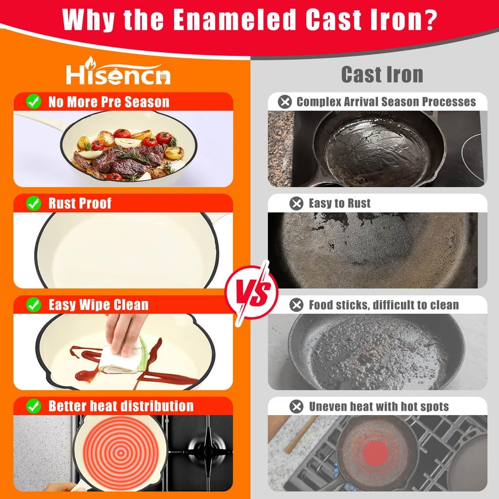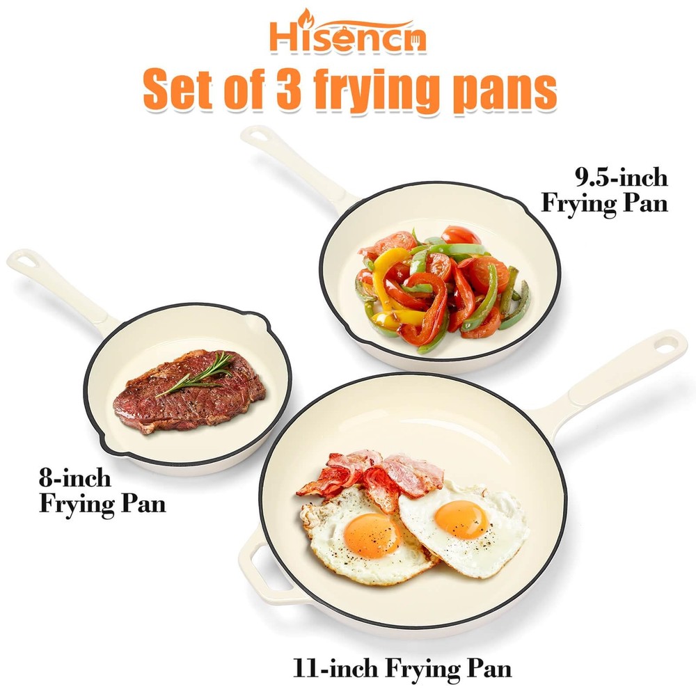 Experience Superior Cooking with 's 3-Piece Enameled Cast Iron Frying Pan Set Elevate your culinary skills with our premium quality cookware set, meticulously crafted for exceptional performance and durability. Whether you're sautéing, grilling, slow cooking, frying or roasting, this versatile set is your ultimate kitchen companion. What's in the Box: 8-Inch Skillet 9.5-Inch Skillet 11-Inch Skillet An excellent gift choice for cooking enthusiasts! Premium Quality: Crafted from durable cast iron. Non-Stick Enameled Coating: Cleanup is a breeze with the non-stick coating, which is free from PFOA, PTFE, lead, and cadmium, ensuring healthy cooking. Versatile Cooking: Compatible with gas cooktops, electric, induction, and ceramic stoves. Oven safe up to 550 degrees Fahrenheit. Cleaning and Maintenance: Simply use a soft sponge or rag for cleaning. Avoid using metal utensils to maintain the ceramic coating's luster. [What's in the Box] - 's 3-piece enameled cast iron frying pan set includes 8-inch frying pan, 9.5-inch fry pan, 11.5-inch skillet. Excellent cookware gift choice for sauteing, grilling, slow cooking, frying, roasting and grilling! [Premium Quality]- The fry pan set material is made of enameled cast iron with excellent heat distribution, heats up quickly and evenly, and the food can be cooked evenly and succulently. Unlike regular cast iron, enameled cast iron offers even more uniform heat distribution, eliminating issues like hot spots that can occur with uncoated cast iron. [Rust-proof & Durable Safe Coating] - The cast iron cookware set boasts a meticulous 5-layer coating system: a robust cast iron interior, fortified with 2 layers of base glaze for stability, and crowned with 2 layers of exterior enamel for a beautiful Cream White finish. This enamel coating is not only crack- and scratch-resistant but also features advanced rust-proof properties, ensuring long-lasting durability. Completely free from PFOA, PTFE, lead, and cadmium, this cookware set is your ideal companion for healthy, worry-free cooking. [No Need for Pre-seasoning] - Unlike traditional cast iron, our enameled cast iron pans do not require frequent oil pre-seasoning after receiving or during routine maintenance. They also won't rust, ensuring long-lasting use and beautiful appearance. [Easy Care & Cleaning] - The high-quality enamel coating makes cleaning simple. Use a soft sponge or rag for easy cleanup. For stubborn stains, soak the pan in warm water for 1 to 2 hours or more, then wash with baking soda or a neutral detergent. To maintain the luster of the ceramic coating, avoid using metal utensils that may scratch the enamel. [Versatile Cooking] - Cookware set compatible with gas cooktops, electric, induction and ceramic. Can be used in ovens up to 550 degrees Fahrenheit for roasting meat. [Classic Design] - Cast iron skillet set with sturdy perforated handles that make it easy to move pot from the stovetop to the oven, hang it easily for storage, or bring a eye-catching dish to the table! The pan comes with pouring ports on both sides, making it easy for you to pour out delicious dishes. [Durable Protection] - To prevent shipping damage, the fire pit is supplemented with protective foam packaging, ensuring it arrives in perfect condition. [Top Quality from ]- The nontoxic enameled cast iron frying pan set has passed a strict inspection process. If the item you receive is defective due to delivery, please contact our 24/7 online customer service immediately, we will reply you within 24 hours to solve your query. Warranty extended to 1 year for quality issues.