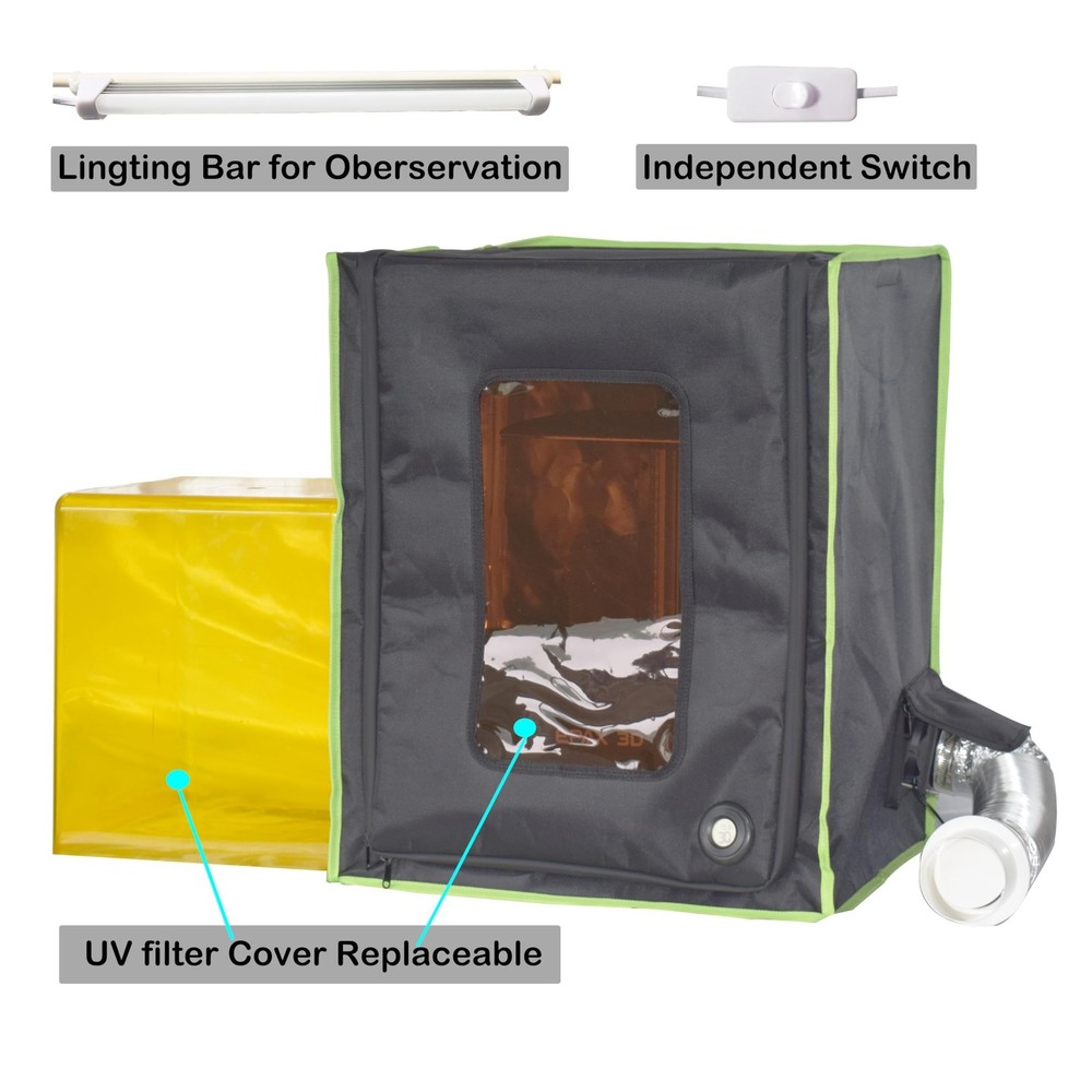 Enclosure for Resin 3D Printer with Ventilation kit and LED Lighting Eliminate or Reduce 3D Printing Smell Constant Temperature Improve Printing Quality Protective Cover for LCD SLA DLP Resin Printers Product Details Size: S- Brand: Makermate MPN: s UPC: 724164998132 EAN: 0724164998132 Brand: Makermate Material: 1680D oxford fiber with reflective film, glassfiber frame Product Dimensions: 15.7"D x 18.9"W x 23.6"H Compatible Devices: Resin printer less than10.1 inch Manufacturer: Bamboofu Trading Product Dimensions: 15.7 x 18.9 x 23.6 inches Item Weight: 6.24 pounds Item model number: s Date First Available: July 4, 2023 Manufacturer: Bamboofu Trading 1Fast extract resin smell ,keep room air freshWith a well sealed ventilation kit,the printing smell will quickly sock out by the exhaust fan,through the extendable duct and emission from the window adapter ,always keep room air avoid pollute from resin odor; both side with ventilation port,more free to arrange exhaust direction,the duct can extend to 3 meters,allow you more space to arrange outlet fixing holes. 2Improve Printing Quality with Constant Temperature All zippers are high quality air tight version,Well sealed printing environment can catch and reuse heated air from printer own cooling fan better,result a stable and warmer working condition,which can contribute to faster resin fluidity,so can improve printing quality,reduce failure rate and resin wastage. 3Proper Size and Wide Compatibilitythe size is only 48*40*60cm,its not too big but enough for most desktop resin printer under 10.1 inch,you can easily put it on your working desk countertop but wont take too much space,so wont bother your other workings on the table 4UV Filter and Enhanced IlluminationThe Watching window made of dark PC film,have same UV filtering function like printer own cover, with it, you dont need to put on/take off the cover for every printing; with a bright lighting bar for you to check printing status, it has independent switch,when you need to check printing, just need to turn on the light, dont need to open the enclosure. 5Simple Installation and Long-term Useunlike others only use 500D material,this enclosure made of high quality 1680D oxford cloth, ,lining with mirror-like reflective layer,much durable and with better heating isolation; it very simple to assemble,10 minutes to go you can assemble the enclosure and 10 more minutes,you can add the ventilation kit ,also with protective gloves for assembling. 6Reduce Noise,Protective coverSince well sealed and made of high density cloth, its have a obvious noise reduce affect ,when printing, not bother your sleep or working. and can use it as protective cover to avoid dust,water , sunlight or moist to damage your printer. Packing List Enclosure with frame1 Ventilation kit1 Lighting bar1 User manual1