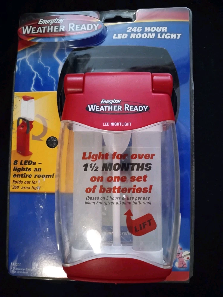 Illuminate your space with the Energizer LED Folding Lantern, Model FL452WRBP. Designed for versatility, this lantern features a durable plastic construction and operates on four D batteries (not included) to provide up to 135 hours of bright, efficient lighting. With a pivoting design, the light easily adjusts to provide 360º coverage, making it ideal for camping trips or power outages. The lantern offers three light modes and eight LEDs, delivering a range of 80-96 lumens to suit your needs. Its compact size, measuring 8 inches in height and 5 inches in width. Experience reliable, high-quality illumination with this weather-ready Energizer lantern, complete with a vibrant red color and cordless convenience. Blister case has very minor cracks in bottom corners,blister is unopened free shipping