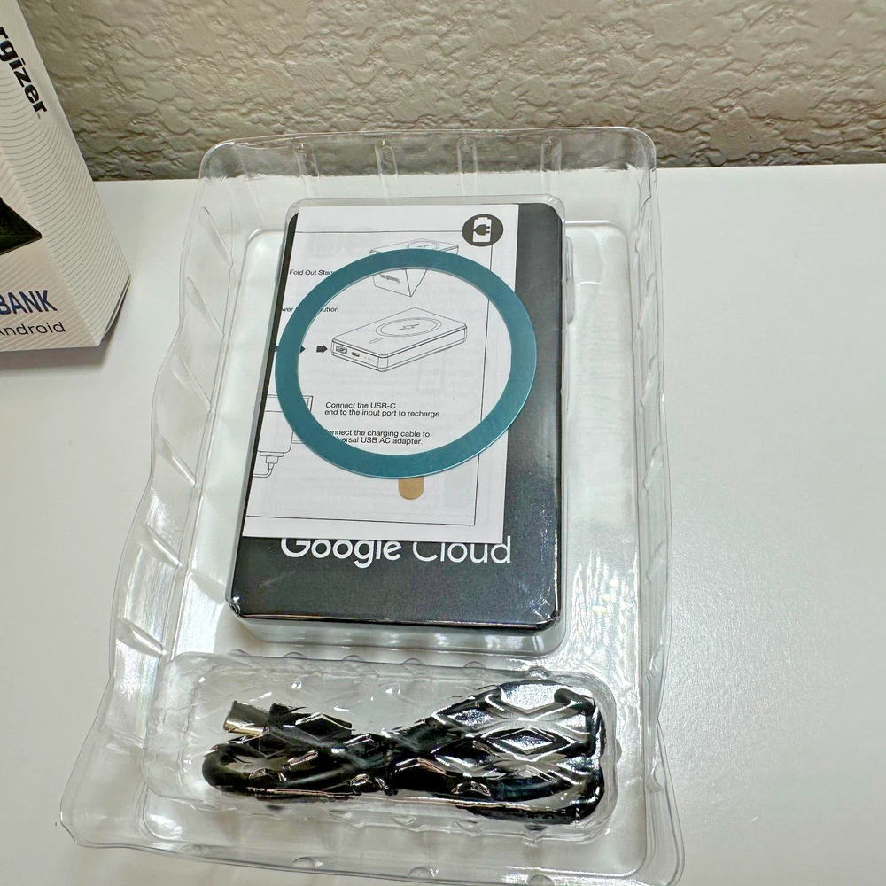 Energizer x Google Cloud Wireless Charging Power Bank Mag-N-Kick iphone/Android QM5004 This Energizer® Mag-N-Kick™ Power Bank magnetically holds to newer compatible phones. It has a convenient fold-out stand to prop up on a desktop surface to keep your hands free. Features: -Strong magnetic attachment (for iPhone Magsafe feature & more) -Wireless charge (7.5W for iPhones, 15W for Android) -Charge & use vertically or horizontally -Includes charging cable Specifications: Model: QM5004 Cell Type: Lithium Polymer Battery Capacity: 5000mAh/18.5 Wh(Max) Rated Input: USB-C 5V/2.4A Rated Output: USB-A 5V/2.4A Raed Output: USB-C 5V/3A Wireless Output: 5W/7.5W/10W/15W Total Output: 15W (Max) Dimensions: 97mm(L) x 63mm (W) x 16mm (H) Brand New, never used, in original box/packaging. Ready to ship!