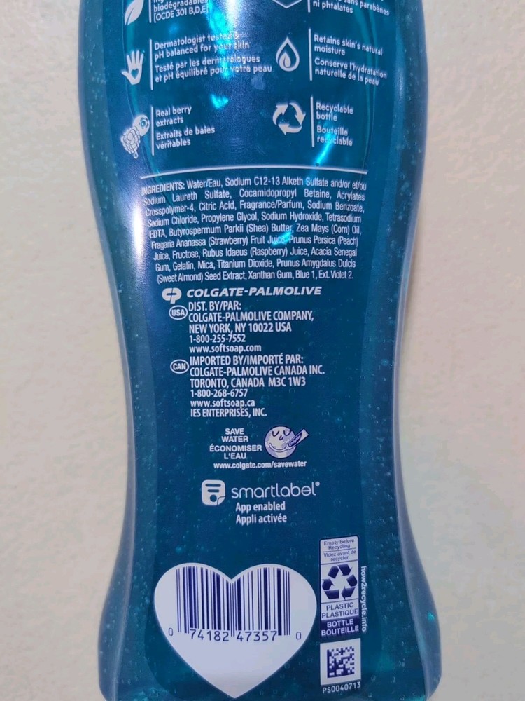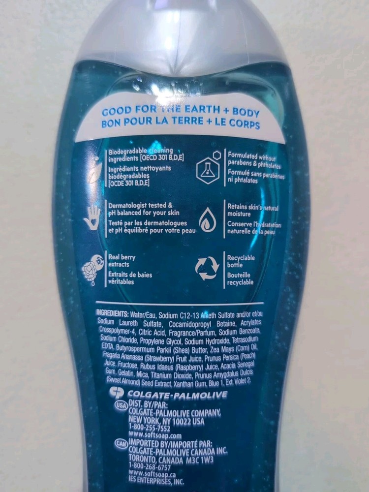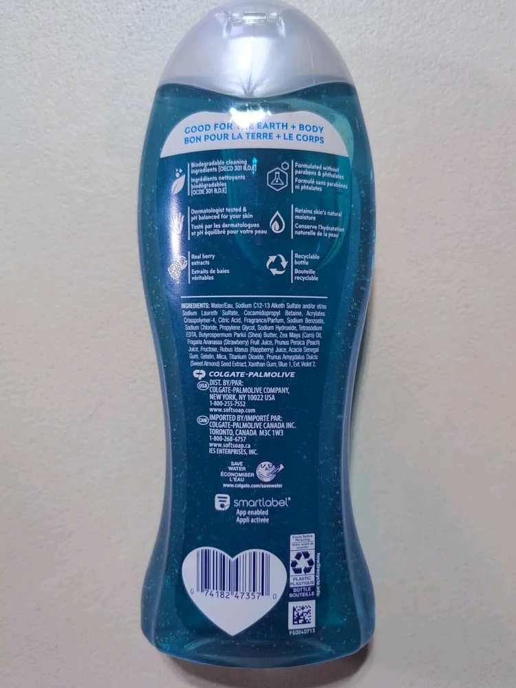 Scent:citrus & Berry splashType:Body WashDepartment:WomenSkin Type:Combination SkinSize:RegularColor:BlueUPC:074182473570Brand:SoftsoapMPN:47357Ingredients:see pictures for complete detailVolume:20oz.Features:biodegradable cleaning ingredients, dermatologist tested and pH balanced for your skin, Real berry extracts, formulated without parabens and Phthalates, retains skins natural moisture, recyclable bottleBody Area:BodyCountry/Region of Manufacture:CanadaProduct Line:softsoapgtin13:074182473570Formulation:Liquid