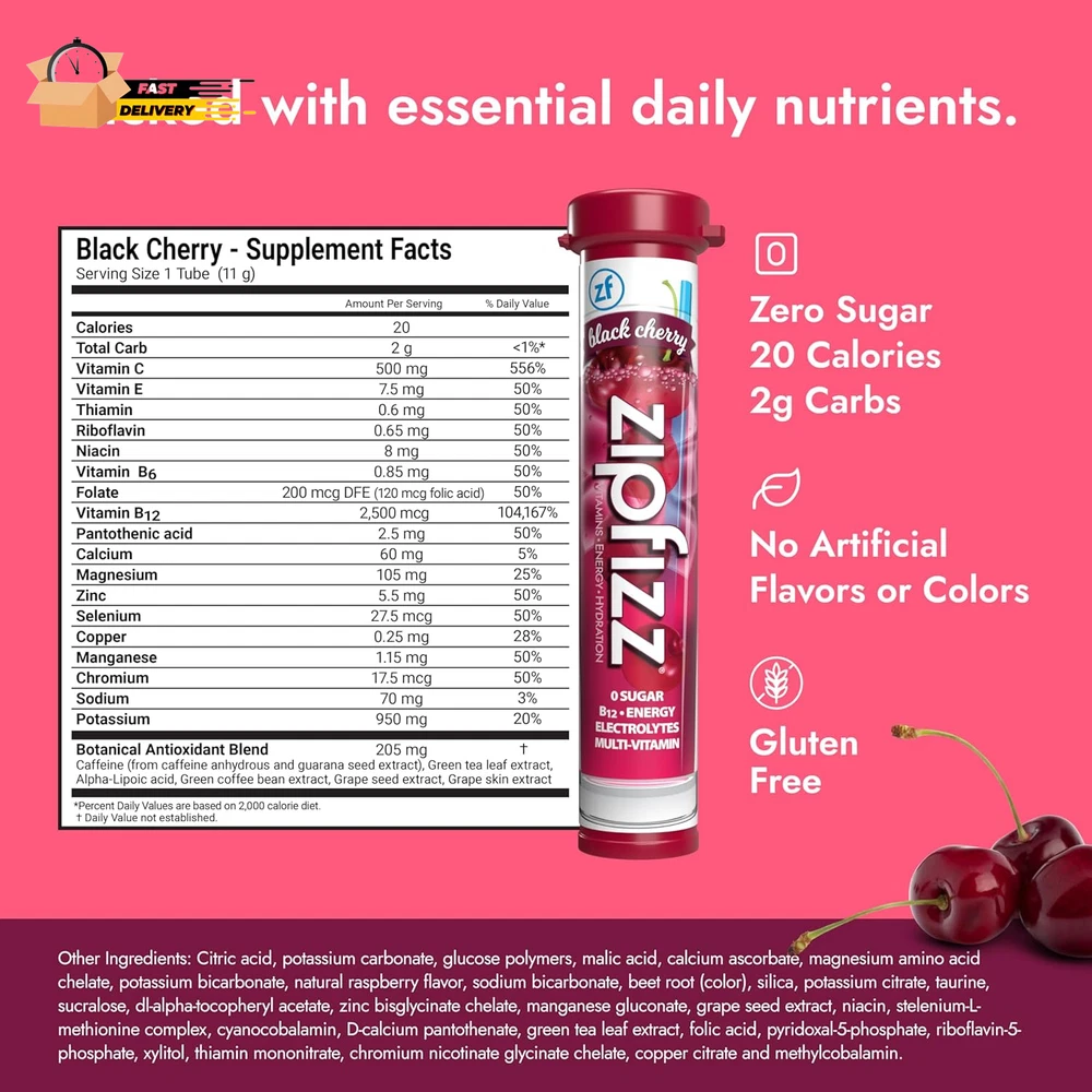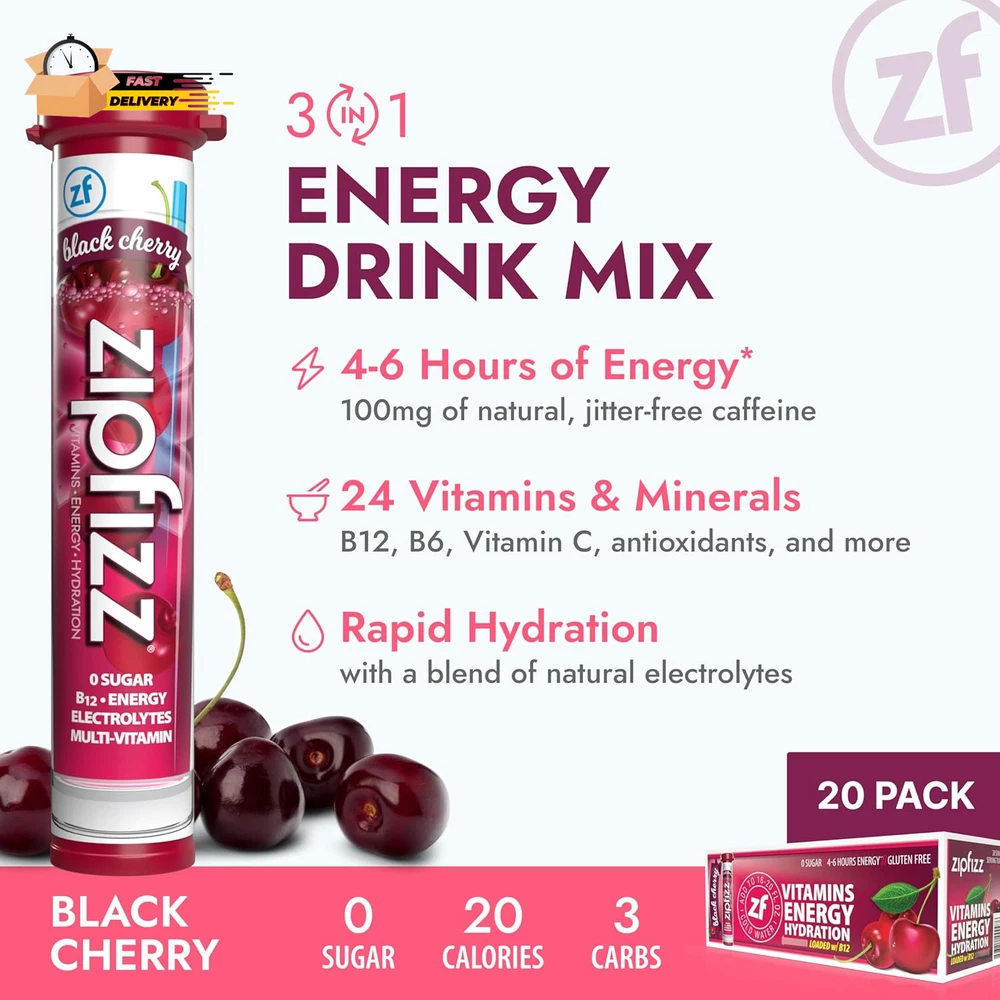 Store New Arrivals Add to Favorite View Feedback Contact Energy Drink Mix, Electrolyte Hydration Powder with B12 and Multi Vitam Description Is Discontinued By Manufacturer No Product Dimensions 5 x 5 x 5 inches; 0.8 ounces Country of Origin USA Caffeine Content 100 Item Weight 22.68 g Flavor Name Black Cherry Package Information Tube Item Form Powder Size 0.39 Ounce (Pack of 20) 3-in-1 Daily Functional Beverage – Zipfizz Energy Drink Powder combines natural ingredients to deliver sustained energy, liquid electrolytes, and immunity support in one sugar-free, low-carb, and low-calorie daily bubbly beverage. Sweet Black Cherry Flavor – Savor the rich and juicy taste of juicy black cherries that will awaken your taste buds and boost your energy. Simply add Zipfizz powder to 16-20 ounces of water or other non-carbonated beverage, shake, and enjoy! Packed with Vitamins and Natural Electrolytes – Our comprehensive formula contains 100% of recommended daily vitamins in two tubes, including 500mg of Vitamin C, 950mg of Potassium, 2500mcg of B12, and 105mg of Magnesium. Zero sugar, no artificial flavors or colors, no preservatives, and gluten free. Convenient and Portable for On-The-Go – From replacing your morning coffee to providing essential post-workout hydration and nutrients, Zipfizz’s single-serving hydration sticks are great for traveling and busy schedules. 100% Happiness Guarantee – We pride ourselves on using healthy, natural ingredients to deliver high-quality taste, nutrition, energy, and hydration. Whether you're an athlete pushing the boundaries of physical performance, a professional striving for success, or a student pursuing academic excellence, Zipfizz is your trusted companion on the journey to greatness. Zipfizz is a sugar-free energy powder packet with natural ingredients and great flavor, making it a healthy alternative to sugary sports drinks, coffee, soda, and more. Each packet provides 4-6 hours of sustained energy with 100mg of natural caffeine and is packed with essential daily nutrients like B12, B6, Vitamin C, Calcium, Folate, Niacin, and Antioxidants. To Use: Fill 16-20 fl oz of cold water into a bottle, pour in one tube of Zipfizz Energy Powder, shake & enjoy! Drink 15-30 minutes prior to exercise for increased performance. ABOUT US We offer the best prices around on high quality products. Our E-store includes media such as books, movies, music and games while offering electronics, toys, sporting apparel, clothing, tools, general home, garden items and more. SHIPPING We are always working hard to ensure your package arrives as soon as possible. Please understand that some factors like weather, high postal traffic, and the performance of shipping companies are outside of our control. We offer free shipping to the lower 48 states and ship within 2 business days of payment, usually sooner. We do not accept P.O. Boxes. Please provide a physical address. For shipping outside of the continental USA, we only use eBay's Global Shipping Program.The item is shipped to KY and then sent to the rest of the world. International customers are responsible for all duties and taxes. Continue to check out in order to calculate costs for shipping the item to your country. Messages regarding eBay's Global Shipping Program MUST be directed at eBay EXCLUSIVELY. RETURNS We offer a 30-Day Return Policy on items which you are not completely satisfied with. You have the option for a full-refund or an exchange of the item. No returns are available on items shipped outside of the USA. PAYMENT We accept PayPal. CONTACT US This page content is yet to come Please ad us to your favorite seller and visit again later Thank You CUSTOMER SATISFACTION We try our very best to make sure every customer is completely satisfied. If there's a problem, message us! We're happy to help. WE ACCEPT Copyright © 2021 AutoDS. | All Rights Reserved