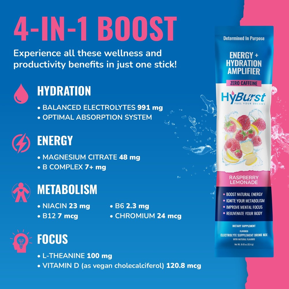 This energy and hydration powder is a game-changer! The raspberry lemonade flavor is refreshing, and the 4-in-1 formula keeps me energized and focused without caffeine. Love the blend of vitamins and electrolytes—perfect for workouts or long days. No jitters, just clean energy and great hydration. Highly recommend!