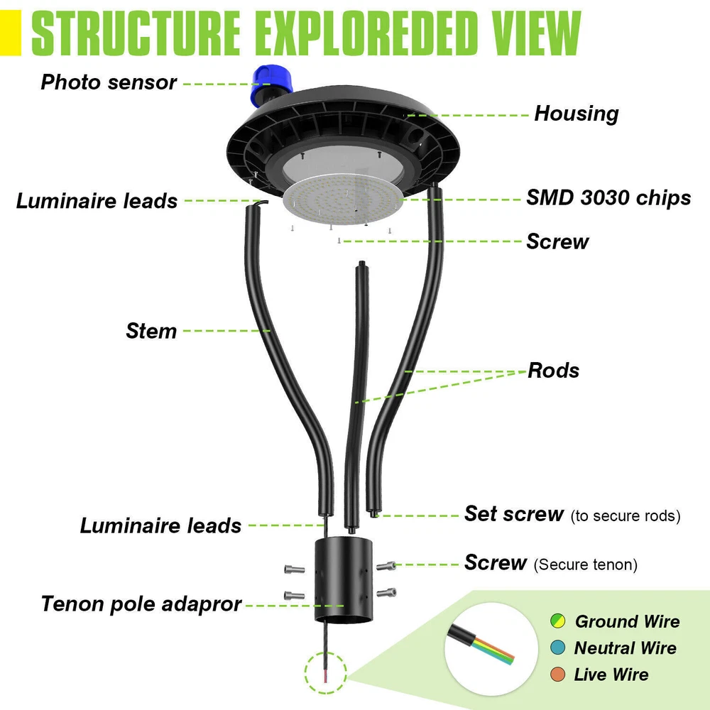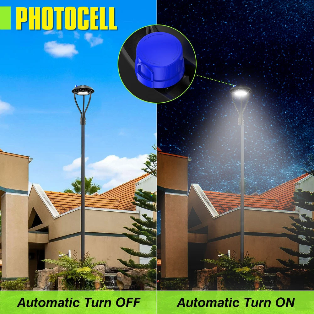Product Description 100W LED Dusk to Dawn Light Outdoor Street Garden Pathway Yard Parking lot Lamp Light Up Larger Area - The 100w light post bring 14000Lm with SMD3030 chips, up to 140lm/watt, AC 100-277V universal voltage and 120°beam angle. 5000K color temperature of lighting is a nice choice for street light illumination. Anti-shock, anti-moisture, no glare, no strobe light, no ghosting, protecting your eyes. Dust to Dawn Photocell - The Led circular post top pole light comes with photocell sensor outside automatically turns ON at sundown/night and light post at sunrise/daytime with dusk to dawn, high power factor >0.9, more than 50000hours lifespan, reduce your electricity consumption, save your electronic bill. Provides a continuous, efficient outdoor lighting environment. Commercial Grade Material - The DLC/ETL Listed post pole light fixture made of die-casting aluminum body + protective glass cover. The scientific design helps the exterior light post top to dissipate better, achieve the best use of the led lighting post. IP65 waterproof for drying, wet environment, sandstorms, snowstorms, and harsh weather conditions. Wide Application - The circular post top design give the lamp a uniform brightness and can be applied to a variety of outdoor scences, such as pathway, street, front yard, city expressway, trunk/rustic road, factories, playground, school, garden, courtyard, parking lot, public park, walkway, exterior, driveway, store, farmyard or any other commercial and industrial area. Installation and Warranty - The pole mount of our post area light fits for a 2 3/8-inch OD tenon & less than or equal to 3 inch standard pole, very easy to install and transfor(Please see the video on the product page for more installation info). KUKUPPO offer you lasting safety and reliability backed by a 5-year warranty. For a bulk order, email us in advance to get a different offer. Specifications: Rated Wattage: 100W Luminous Flux: 14000Lm Color Temperature: 5000K Protection Grade: IP65 Material : Aluminum Body+Glass Cover Input Voltage : AC100-277V 50/60Hz Dimension: Dia 400x650 mm Base: 2 Pins Wire Power Factor: >90% Beam Angle : 120 degrees Average Lifetime : More than 50000 hours Flexible Installation The pole mount of our post area light fits for a 2 3/8-inch OD tenon & less than or equal to 3 inch standard pole, very easy to install and transfor Commercial Grade Material DLC/ETL Listed quality. Scientific design helps the exterior light post top to dissipate better, achieve the best use of the led lighting post. Durable Support Rod Made of thick aluminum, stable and strong, waterproof and rustproof. High performance quality provides with lasting safety and reliability. Ultra Bright LED Chips With SMD3030 chips, up to 140lm/watt. Anti-shock, anti-moisture, no glare, no strobe light, no ghosting, protecting your eyes. Kindly Note Please note that the light can not be used IN the water. Please confirm the wire connection is right while installing. About Us Payment Shipping Returns Contact Us SHENZHEN NUOGUAN TECHNOLOGY CO. LTD founded in 2010. We are high-technology comany specialized in manufacture Commercial and industrial LED light. Advanced production equipment and excellend R&D ability help us to combining service ,production sell together provide top-level products to our customers. 1. Payment is expected within 7 days of auction close. Or Unpaid Items will be forfeited per eBay . 2. Taxes may be applicable at checkout as states adopt new laws and regulations regarding sales tax collection. 1. We ONLY ship to USA . 2. Orders processed within 1-2 business day of payment verification. There’s no Delivery service or courier service on Saturdays, Sundays or Public Holidays. 3. We have 3 different warehouse in US,so due to stock status and time differences, we will choose to ship your item from our first available warehouse for fast delivery. 4. We offer Free Shipping within the Lower 48 states! All packages are sent via UPS or USPS.The delivery time for UPS Ground is typically 2-5 business days. We strive to ensure 100% satisfaction for each and every one of our customers. we offer a 30-day 100% money-back guarantee on all eBay orders. If your item isn't just as you wished, simply send it back to us and we'll refund or replace your item. Please note that all returns must be authorized by our Customer Service department. please contact us though message first if you have any problem. USA Warehouse. Fast shipping! We are appreciated your purchasing form our eBay store. Office Time: 9:30 - 18:30, Monday - Saturday (UTC+8) Please contact us with eBay Message. We will respond you within 24 hours on business day. About Us SHENZHEN NUOGUAN TECHNOLOGY CO. LTD founded in 2010. We are high-technology comany specialized in manufacture Commercial and industrial LED light. Advanced production equipment and excellend R&D ability help us to combining service ,production sell together provide top-level products to our customers. Payment 1. Payment is expected within 7 days of auction close. Or Unpaid Items will be forfeited per eBay . 2. Taxes may be applicable at checkout as states adopt new laws and regulations regarding sales tax collection. Shipping 1. We ONLY ship to USA . 2. Orders processed within 1-2 business day of payment verification. There’s no Delivery service or courier service on Saturdays, Sundays or Public Holidays. 3. We have 3 different warehouse in US,so due to stock status and time differences, we will choose to ship your item from our first available warehouse for fast delivery. 4. We offer Free Shipping within the Lower 48 states! All packages are sent via UPS or USPS.The delivery time for UPS Ground is typically 2-5 business days. Returns We strive to ensure 100% satisfaction for each and every one of our customers. we offer a 30-day 100% money-back guarantee on all eBay orders. If your item isn't just as you wished, simply send it back to us and we'll refund or replace your i