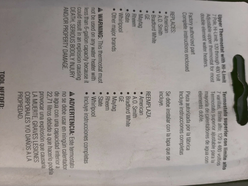 Brand:UtilitechModel:UpperCompatible Model:321898-000Color:SilverItem Weight:2 lbUPC:0020363175993Voltage:240 Vgtin13:0020363175993Power Source:Corded Electric, BatteryItems Included:AdapterType:Water Heater ElementItem Diameter:5 inMaterial:PlasticTank Capacity:Less Than 20 galGTIN:0020363175993Compatible Product:Point-Of-Use Water Heater, Storage Tank Water HeaterItem Height:9 inPower:1000 W or Less
