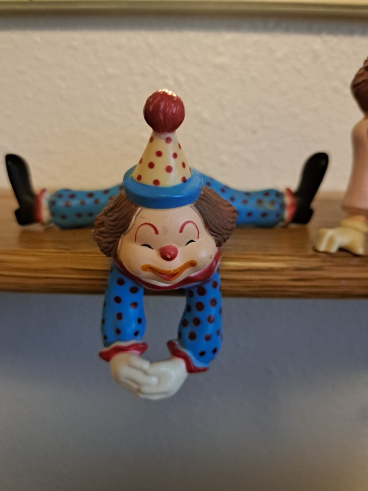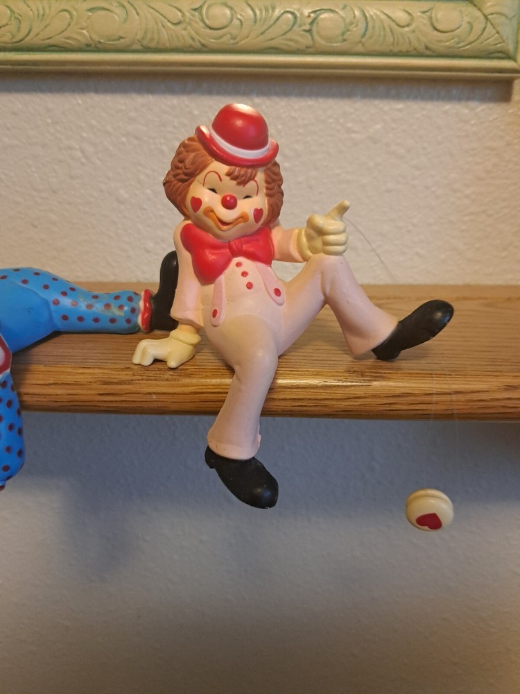 2 Shelf Sitter Enesco Clowns Valentine Figurines 5 inch pink with yoyo, 5 inch wide blue doing splits.