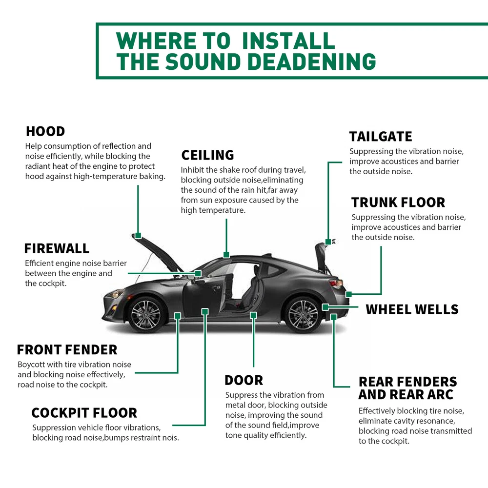 Specifications: Condition: 100% brand new Features: Car heat / sound insulation Placement on Vehicle: Front/Rear/Left/Right Reinforced / Crush Resistant: Yes Mildew & Mold Resistant: Yes Water resistant: Yes Non-toxic: Yes Material: Aluminum & Foam & Adhesive Backing Size:1m*1m=39INCH*39INCH=11sq.ft Thickness: 5mm=197mil=1/4INCH Feature: Yetkole Best choice of motor parts Engine Hood Noise Reduction Pad 39"*39" Fireproof Self-Adhesive Sound Deadener Specifications: Condition: 100% brand new Features: Car heat / sound insulation Placement on Vehicle: Front/Rear/Left/Right Reinforced / Crush Resistant: Yes Mildew & Mold Resistant: Yes Water resistant: Yes Non-toxic: Yes Material: Aluminum & Foam & Adhesive Backing Size:1m*1m=39INCH*39INCH=11sq.ft Thickness: 5mm=197mil=1/4INCH Feature: 1. Durable housing for harsh environments 2. Easy to cut and fit, with strong adhesion 3. Due to its excellent load resistance, it is very suitable for underfloor applications 4. High temperature resistance, high noise reduction and insulation performance, non combustible and flame retardant 5. Easy to install, suitable for various car models, simply trim piece s to fit, peel and place and hand roll to ensure good adhesion. No messy spray paint or adhesive is required to install this product. 6. Can be used for the entire interior of any vehicle including: floor panel, door, carpet under/seat, headliner/roof, trunk, trunk lid, firewall (internal side). 7. By reducing or suppressing the sound vibration of the metal plate, you can eliminate road noise. 8. This car insulation is used in many applications, such as muscle cars, hot rods, light cruisers, imports, tuners, street rods, mouse rods, classic cars, racing cars, stock cars, old antique cars, pickups, trucks, low rider and many more. We even have customers using it on their SUVs, vans, RVs, luxury cars, campers, yachts, RVs and school buses. Features & Details: 【Reduce road noise】If you often drive on uneven roads or on noisy highways, sound insulation can bring you more comfort. It will reduce the noise of roads and other drivers. It will make your driving smoother and have the added benefit of better media listening 【Enhance the music】Use sound insulation to make your radio clearer. You will no longer have to turn it up because of traffic noise. Not only is it good for music, but audio books and telephones will sound better, too 【Improve privacy】If you don't want other people on the road to hear what you're listening to, the sound insulation prevents the noise from escaping. Sound insulation will help you 【Warm in winter and cool in summer】The car insulation will help reduce your interior temperature in the summer, and in winter, the heat insulation can keep you warm in the car, which is conducive to warmth reduce engine/tunnel/console 【Protect car paint】In summer, the temperature is too high, the engine runs at high speed and accelerates for a long time, and generates heat, which can easily cause the aging and fading of the car paint; the heat insulation pad can protect it 【Increase the life of the car】In summer, due to high temperature and long-term driving, it is easy to cause the cabin to heat up and cause a fire, which may seriously damage your car. Using heat insulation pads can extend the life of the car Installation: 1. Please clean the surface you want to paste. 2. Make insulation materials and sheet metal firm fit, and play best adhesive, damping performance. 3. It is best not to repeatedly tear and paste during the successful installation process, otherwise the paste effect will be destroyed. Package included: 1x Heat Sound Deadener Insulation Mat 1x Rollers 4x Installation Tools (Please allow 1-3cm difference due to manual measurement.) Important Note: Please allow slight dimension difference due to different manual measurement. Due to the light and screen setting difference, the item's color may be slightly different from the pictures. If you have any questions about quality, shipping or other problems, please contact me first via eBay message. I will give you a satisfy solution. Item Specifics Brand Modigt Type Carpet Mat, Heat Sound Deadener Insulation Material Aluminum & Foam & Adhesive Placement on Vehicle Cargo/Trunk/Bonnet/Dashboard/Under Seat/Doors Color Silver Features Easy to install, waterproof, fireproof, mildew proof Universal Fitment Yes Manufacturer Warranty 2 Years Function Noise Reduction, Easy to Cut, Self-Adhesive Function 1 Protects Paint from Blistering Function 2 Reduce the road/ Engine/ Wind noise Function 3 Dustproof, Waterproof, Anti-moisture Application1 Turbo,Front Fender,Rear Fender Application2 Hood,Firewall,Doors,Floor,Roof Application3 Trunk Lid,Trunk Room,Engines,Tailgate Application4 Ceiling,underneath bonnets,Underfelt Application5 Classic Car,Race Car,Stock Car,Old Vintage Car,Pickup,SUV,Caravan Application6 Cockpit Floor, Tailgate, Firewall U Type Wall Application7 For Use in The Application Of Any Sound Application8 Car& Home Interior Heat Sound Deadener Application9 Car& Home Interior Heat Sound Deadener Insulation Thickness 5mm=197mil =1/4INCH NOTE with free rollers Manufacturer Part Number Car Heat / Sound Insulaiton Deadener Superseded Part Number Heat Sound Deadener Insulation Mat Interchange Part Number Deadening Material Insulation Cars & Truck Fitment Type Direct Replacement Finish Matte Size 1m*1m=39INCH*39INCH=11sq.ft Payment 1. It will be much appreciated that you finish your payment asap or it will make UPI (unpaid item case) on your account leading to be suspended or restricted by eBay when those UPI cases carry over to certain amount. 2. Any problems please contact us for more details. Shipping 1. All items will be shipped to buyer's ebay address. 2. All items will be shipped within 24-48 working hours upon receipt of payment, and multiple items will be combined shipping. 3. In most cases, delivery takes around 3-5 business days, it's highly depended on the efficiency 