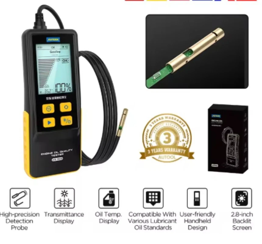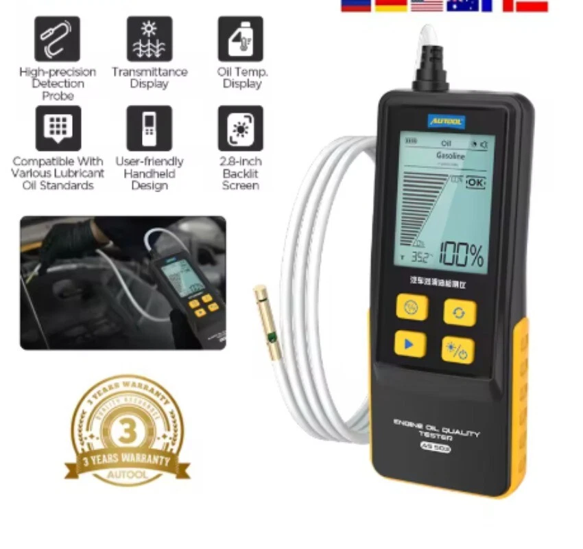 AS503 Engine Oil Tester with Digital Display for Auto Check Gasoline & Diesel Car Engine POA Oil Quality Repair Tools AS503 Engine Oil Tester is a specialized oil testing device tailored for the automotive inspection and maintenance sector. Its primary function involves measuring the transparency of engine oil within gasoline or diesel engines. This measurement reflects the presence of impurities and contaminants within the oil. Consequently, it assesses the quality and performance of engine oil, effectively preventing potential engine issues and malfunctions, thereby ensuring the engine operates normally and efficiently. Note : The main functions of AS503 and AS505 include measuring the transparency of engine oil in gasoline or diesel engines. The measured value reflects the existence of impurities and pollutants in the oil. It can detect impurities produced by mechanical friction of metals. You can directly use the old engine oil for the test. thank you AUTOOL AS503 Engine Oil Tester Features: 【Optical Principle Precision Test】Auto Oil Quality Check,The 2.8 Inchs LED display can accurately display the results and the readings are clearer.Use the optical principle to check the engine oil condition,with a clear display for efficient operation even in varying lighting conditions,be it bright daylight or dim nighttime.Use the optical principle to check the engine oil condition and get the latest oil condition in anytime and anywhere.get the latest oil condition in anytime and anywhere. 【Sound Alarm】when the transmittance is between 100% and 60%,there is no need to change engin oil.when the transmittance is between 60% and 30%,an exclamation mark will be displayed on the screen to remind you to change the engin oil. when it isbelow 30%.the engin oil tester will emit a “beep”alarm to remind you to change the engin oil immediately to ensure safety.[ T] to indicate the current oil measurement temperature. 【Premium Quality】The body's handheld portion is lined with silicone substrate,providing excellent grip & lightweight design for easy single-handed operation. The 800mm long probe designoffers a more flexible & convenient way ofconducting tests.The hose is made of PTFE material,highly resistant to oil&oxidation,and boasts exceptional corrosionresistance, effectively extending the product's lifespan. Operation steps: 1.wipe the test probe clean 2.remove the oil dipstick 3.press the ↶ button to select the vehicle's engine type 4.submerge the testing probe into the engine oil 5.press the ►buteon to start the test 6.the interface will display the test results Oil Temperature Measurement: Built-in temperature sensor measures and displays the actual oil temperature, reflecting the engine's operational status and load. Ensures measurement results are within the normal working temperature range. Compatible with Various Lubricant Oil Standards: Suitable for the majority of gasoline and diesel engine lubricant oils available in the market. Separate sampling and measurement for gasoline and diesel engines allow for more precise assessment of lubricant oil health. Flexible Hose Probe for Convenent Testing: The 800mm long probe design offers a more flexible&convenient way ofconducting tests. The hose is made of PTFE material, highly resistant to oil&oxidation, and boasts exceptional corrosion resistance, effectively extending the product's lifespan. High-pregision Optical Probe: Integrated with a high-precision optoelectronic sensor, ensuring more accurate measurement results. Large LCD with High Definition: Equipped with a backlit 2.8-inch LCD screen, providing users with a clear display for efficient operation even in varying lighting conditions, be it bright daylight or dim nighttime. User-friendly Handheld Design: The body's handheld portion is lined with silicone substrate,providing excellent grip & lightweight design for easy single-handed operation. Why Choose the AUTOOL Automotive Engine Oil Tester? The AUTOOL Automotive Engine Oil Tester is a professional tool designed for the automotive maintenance field. It is capable of measuring parameters like engine lubricant transparency and oil temperature. This device stems from AUTOOL's independent research and development, boasting several intellectual property rights. Moreover, it has received authoritative certifications from organizations like CE, FCC, and ROHS. Since engine oil play a key role in lubrication, cooling, rust prevention, cleaning, sealing, and buffering, using the AUTOOL Car Engine Oil Tester can effectively prevent engine issues and breakdowns. Through simple testing procedures, users can obtain accurate lubricant quality analysis and maintenance recommendations, ensuring the engine operates efficiently and extending its lifespan.