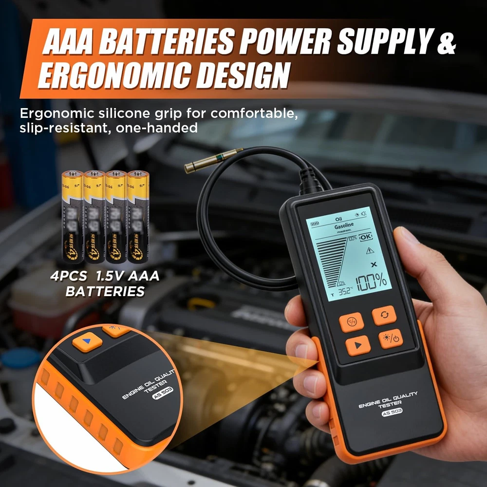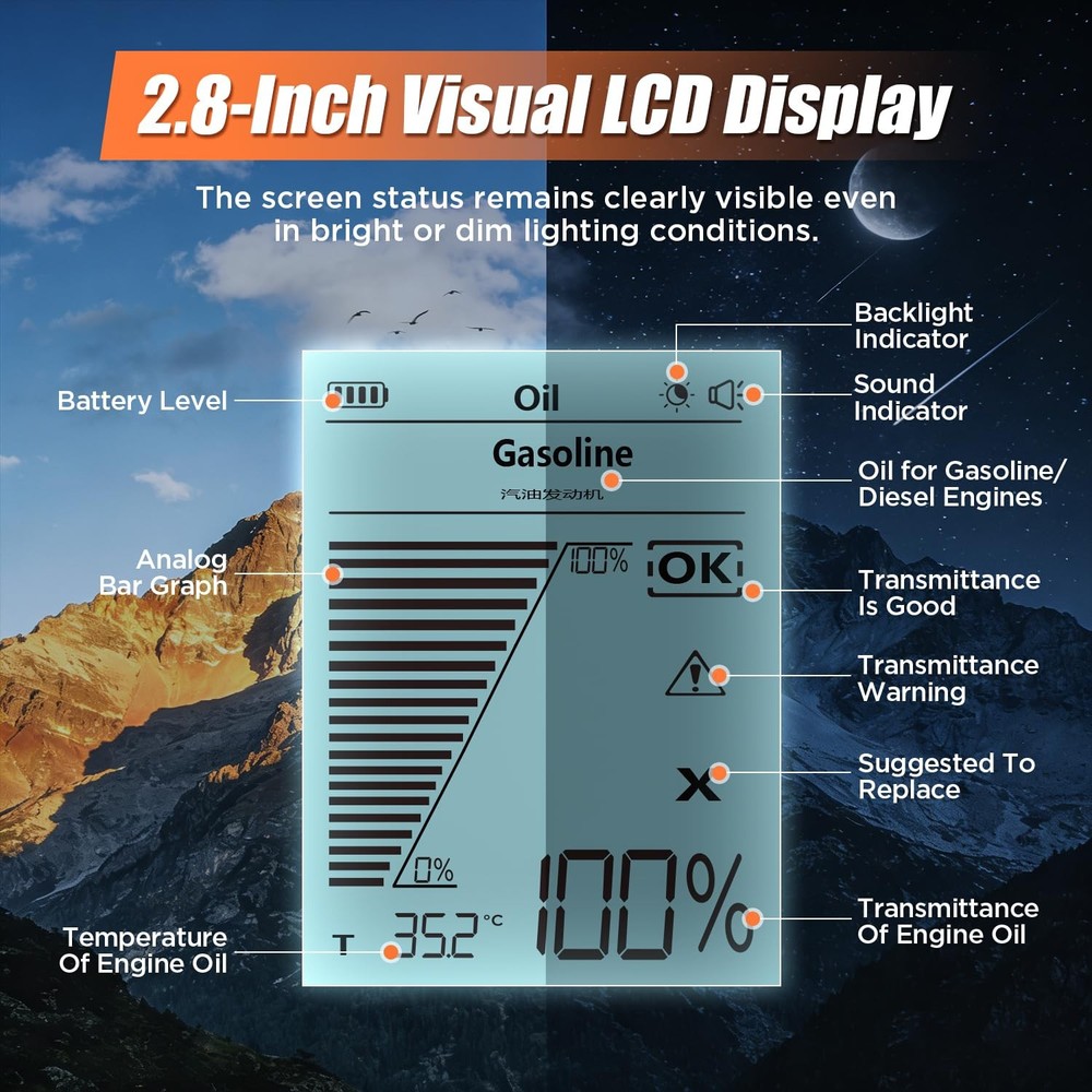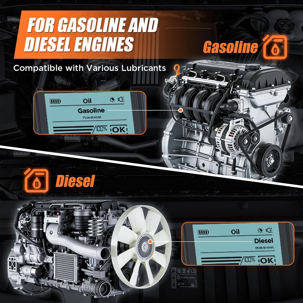 Free eBay listing template designed by dewiso.com Engine Oil Tester for Gasoline and Diesel Vehicles, Engine Oil Quality Tester, High Precision Analyzer with 2.8" Backlit Display, 31.5" PTFE Hose, Temperature & Transmittance Display FREE AND FAST SHIPPING! About this item Transmission Measurement and Oil Temperature Measurement: Insert the probe into the oil reservoir to measure light transmission, which provides a clear visual indicator of oil impurities or contamination. The built-in temperature sensor simultaneously measures and displays the current oil temperature, helping you assess engine performance. Temperature range: -10°C to 125°C (14°F to 257°F). Dual-Mode Compatibility: This engine oil quality tester supports simultaneous detection of both gasoline and diesel engine oil types, compatible with multiple lubricant standards. It works with most commercial gasoline and diesel engine lubricants, helping you monitor lubricant condition. Switch between Celsius/Fahrenheit display modes to show real-time oil temperature, ensuring operation within safe temperature ranges (-10°C to 60°C). 31.5" FLEXIBLE PTFE PROBE and DURABLE DESIGN: The 800mm oil-resistant Teflon hose reaches deep into various engine oil compartments. It provides outstanding oil resistance, oxidation resistance, and corrosion resistance. The high-precision photoelectric sensor ensures lab-grade accuracy, while the silicone grip provides comfortable, slip-resistant handling. 2.8" Backlit Lcd Screen & User-Friendly Operation: The large, clear display shows transmittance percentage, temperature, oil type, and status indicators, even in bright or low-light conditions. Automatically powers off after 5 minutes of inactivity to conserve power. Complete Kit: Includes 4 AAA batteries (ready to use), an English manual, If you have any questions or need assistance, please click “Contact Seller.”—our dedicated customer service team will provide you with a satisfactory solution. Product We offer a 30-Day Return Policy on items which you are not completely satisfied with. You have the option for a full-refund or an exchange of the item. No returns are available on items shipped outside of the US . Shipping We offer Free Shipping to the US and ship within 2 business days of payment, usually sooner. We use UPS express shipping. That's why your products are usually delivered within 3 days . Contact We try our very best to make sure every customer is completely satisfied. If there's a problem , message us! We're happy to help. 24/7 live chat available.