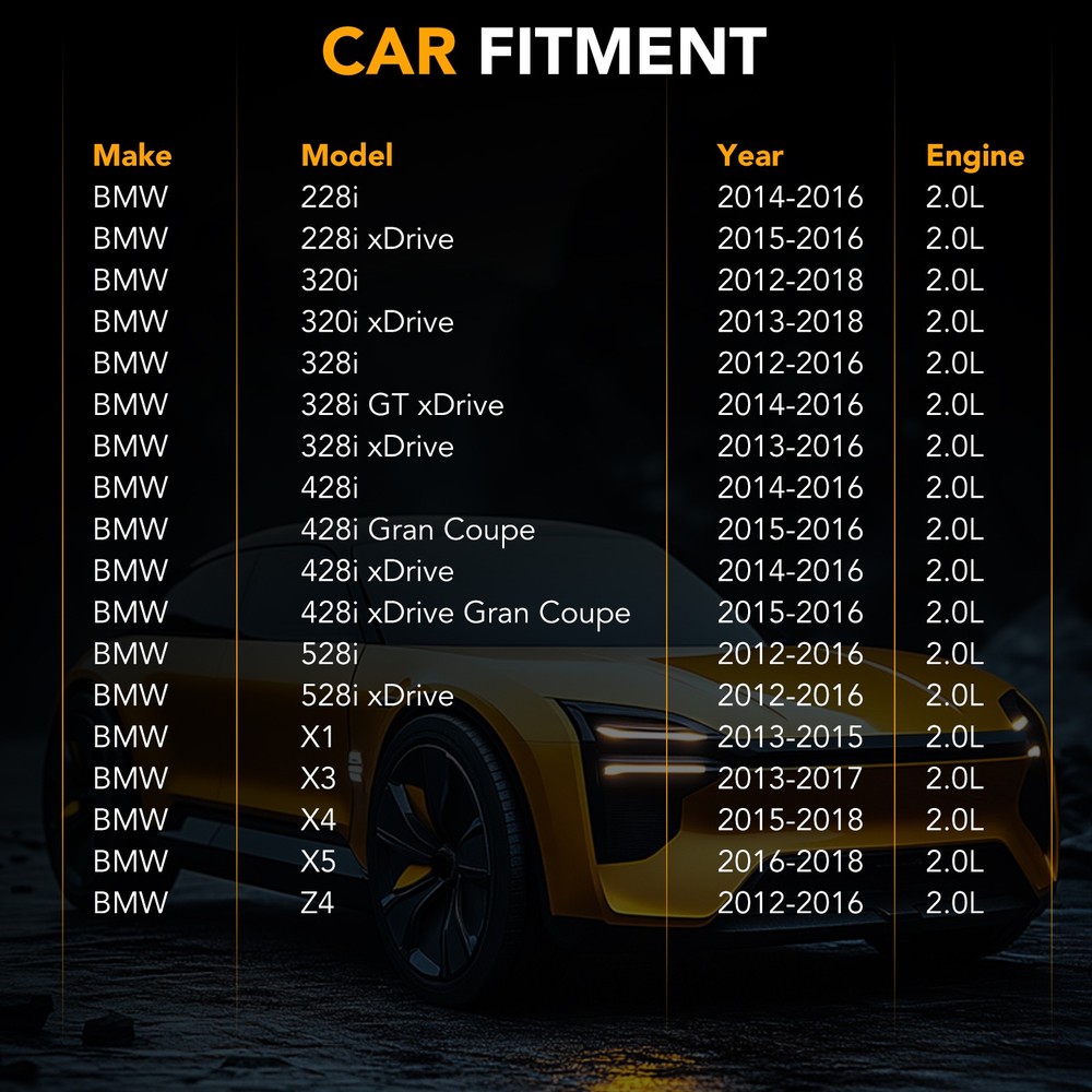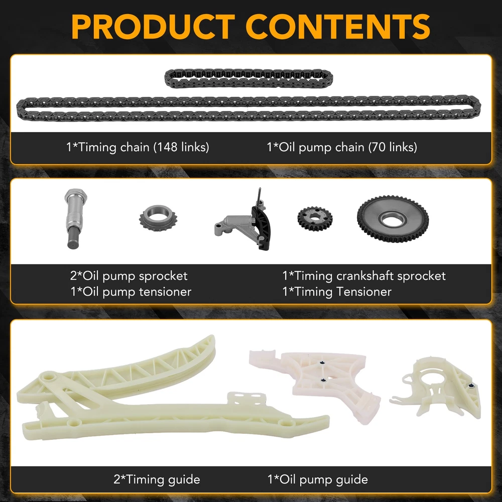 Engine Timing Chain Kit Fit For BMW X1 X3 X4 X5 Z4 228i 320i 328i 428i 528i 2.0L Fitment for: BMW 228i 2014-2016 2.0L BMW 228i xDrive 2015-2016 2.0L BMW 320i 2012-2018 2.0L BMW 320i xDrive 2013-2018 2.0L BMW 328i 2012-2016 2.0L BMW 328i GT xDrive 2014-2016 2.0L BMW 328i xDrive 2013-2016 2.0L BMW 428i 2014-2016 2.0L BMW 428i Gran Coupe 2015-2016 2.0L BMW 428i xDrive 2014-2016 2.0L BMW 428i xDrive Gran Coupe 2015-2016 2.0L BMW 528i 2012-2016 2.0L BMW 528i xDrive 2012-2016 2.0L BMW X1 2013-2015 2.0L BMW X3 2013-2017 2.0L BMW X4 2015-2018 2.0L BMW X5 2016-2018 2.0L BMW Z4 2012-2016 2.0L Replaces OE Number: 11317603944, 11318685091, 11318648732, 11317592850, 11317592877, 11417605367, 11418663609S1, 11417605367S1 Package Included: 1*Timing chain (148 links) 1*Oil pump chain (70 links) 2*Oil pump sprocket 1*Timing crankshaft sprocket 1*Oil pump tensioner 1*Timing Tensioner 2*Timing guide 1*Oil pump guide Feature: 2 Year Warranty Material:Alloy Steel, Aluminum Alloy 100% brand new 100% factory inspection and re-inspection before shipment Easy Installation,Direct Replacement Stable characteristics, high reliability Aftermarket Products with Premium Quality Profession install is highly recommend US Fast Free Shipping One day shipment Perfect after-sales service: 1. We maintain high standards of excellenceand strive for 100% customer satisfaction! Please don't open cases or return requests without contacting us. If you have any questions about quality, shipping or other problems, please contact me first via eBay message. I will give you a satisfy solution. 2. If you are not sure if these are the right parts for your truck please email me your bill of material number and i will check it for you Payment Delivery details Terms of sales About us Contact us Payment 1.We only accept PayPal. PayPal is the only online payment method we accept. Please make sure you have a valid/confirmed PayPal account prior bidding. 2.All Paypal Payments must be Confirmed. Payment must be made within 48hrs of the auction end time. Non-Paying bidders will be reported. 3.When you get your package,maybe you will pay some charges, it's taxes for local customs,not pay to us, and the fees are depends on the customs, all buyer are same. Delivery details 1.Items will be shipped within 2 business days after payment is received. 2.We ship to your eBay address. Please make sure your eBay address is correct. Buyer takes responsibility if eBay address is wrong. 3.Import duties, taxes and charges are not included in the item price or shipping charges. Please check with your country customs office for these additional charges. 4.We shipping using UPS or USPS from our nearest warehouse to you. Tracking numbers will be emailed upon shipment. Terms of sales 1.Please feel free to email us if you have any question. 2.We appreciate you contact us via eBay message when you are not satisfied rather than open case or leave negative feedback directly. We'll try our best to solve the issue. 3.Refund will be issued once we receive your returned items. Buyer is responsible for all return shipping charges. 4.Please contact us for return process before you return the item. 5.All items for exchange or refund must be returned in "as new" condition. About us We are the responsible seller ,always provide high-quality products and best service .If you have any questions, please contact us, and will try our best to help you. Please contact us by eBay Message, and we will reply you within 24 hours. Thank you very much! Contact us We are the professional auto parts manufacturer , and provide line lock, AN hose end fittings , fuel line , fuel filter , fuel regulator , exhaust cutout , exhaust tips , exhaust muffler and so on .The quality of the product to be secured. If you have any questions or any needs , please contact us , and will try our best to help you.