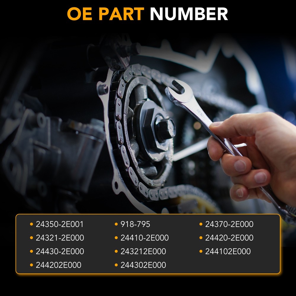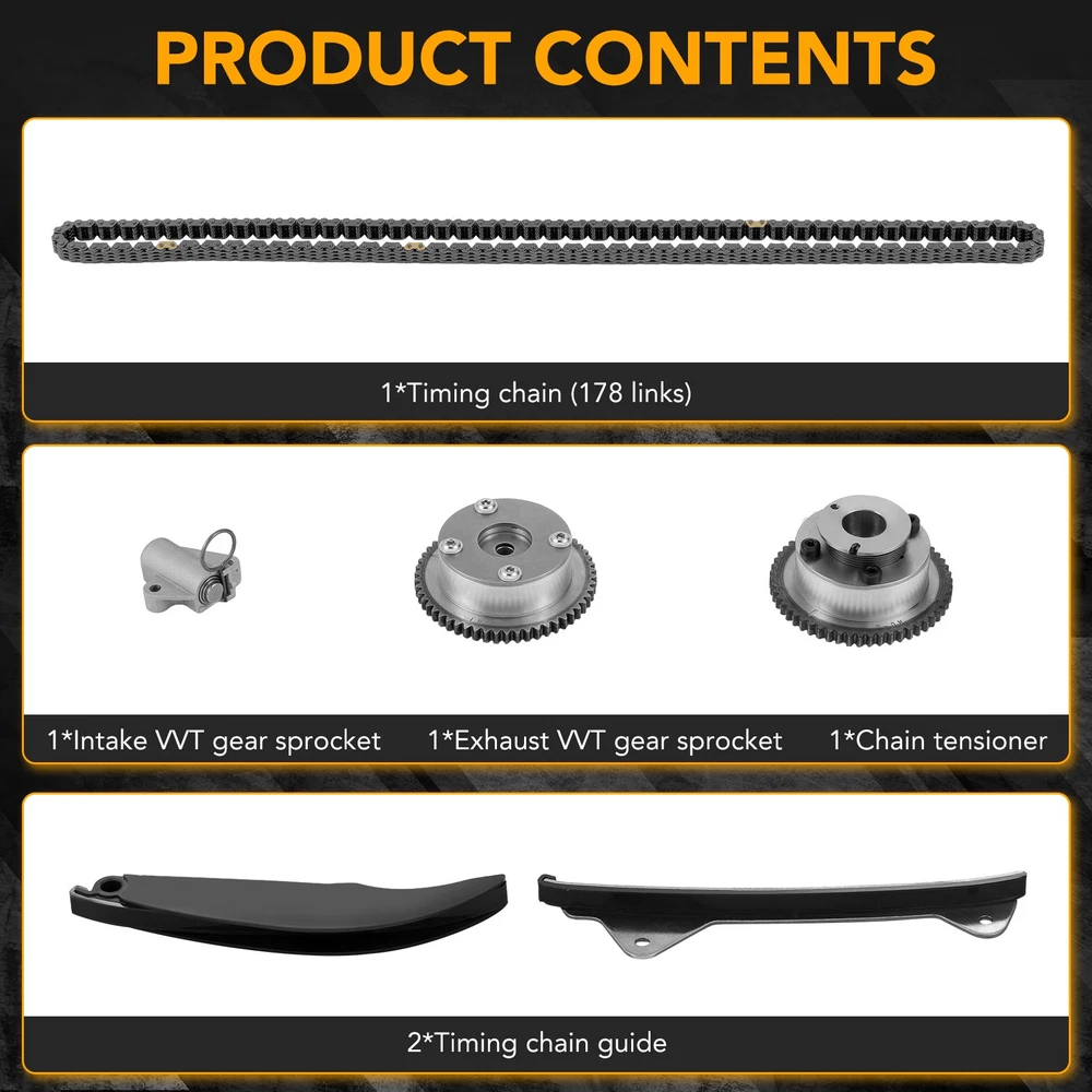 Fitment for: Hyundai Elantra 2011-2013 1.8L Hyundai Elantra GT 2013 1.8L Kia Soul 2012-2014 2.0L Replaces OE Number: 24350-2E001, 918-795, 24370-2E000, 24321-2E000, 24410-2E000, 24420-2E000, 24430-2E000, 243212E000, 244102E000, 244202E000, 244302E000 Package Included: 1*Timing chain (178 links) 1*Intake VVT gear sprocket 1*Exhaust VVT gear sprocket 1*Chain tensioner 2*Timing chain guide ( as shown in the picture) Fitment for: Hyundai Elantra 2011-2013 1.8L Hyundai Elantra GT 2013 1.8L Kia Soul 2012-2014 2.0L Replaces OE Number: 24350-2E001, 918-795, 24370-2E000, 24321-2E000, 24410-2E000, 24420-2E000, 24430-2E000, 243212E000, 244102E000, 244202E000, 244302E000 Package Included: 1*Timing chain (178 links) 1*Intake VVT gear sprocket 1*Exhaust VVT gear sprocket 1*Chain tensioner 2*Timing chain guide ( as shown in the picture) Feature: 2 Year Warranty Material:Alloy Steel, Aluminum Alloy 100% brand new 100% factory inspection and re-inspection before shipment Easy Installation,Direct Replacement Stable characteristics, high reliability Aftermarket Products with Premium Quality Profession install is highly recommend US Fast Free Shipping One day shipment Perfect after-sales service: 1. We maintain high standards of excellenceand strive for 100% customer satisfaction! Please don't open cases or return requests without contacting us. If you have any questions about quality, shipping or other problems, please contact me first via eBay message. I will give you a satisfy solution. 2. If you are not sure if these are the right parts for your truck please email me your bill of material number and i will check it for you